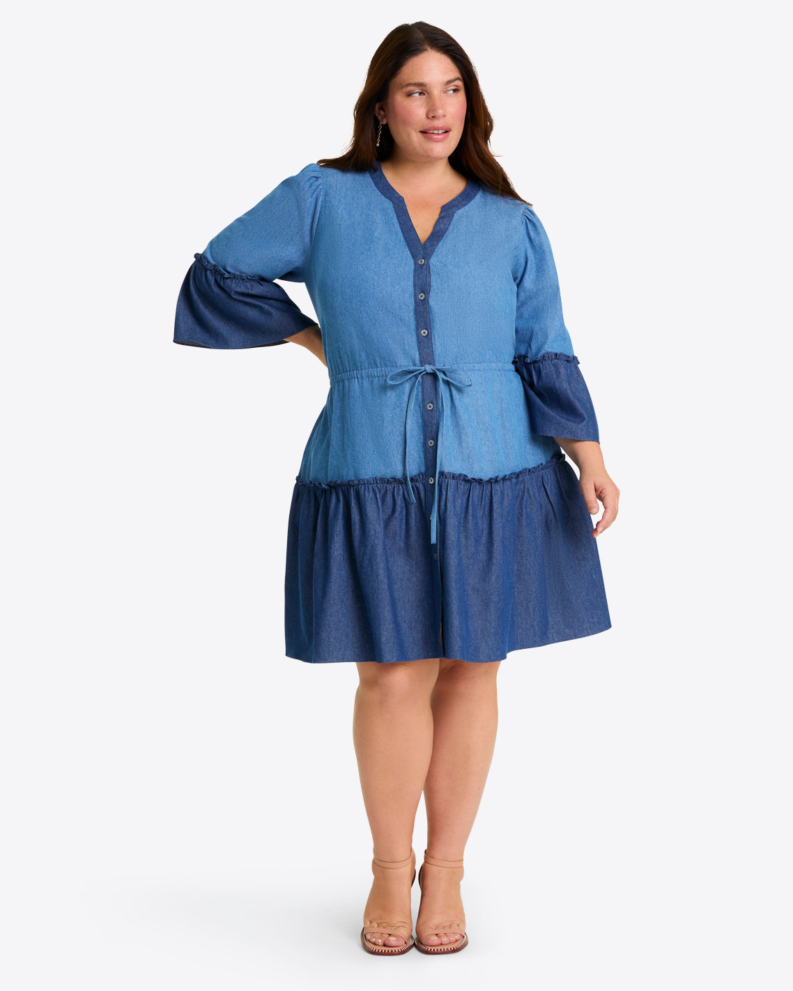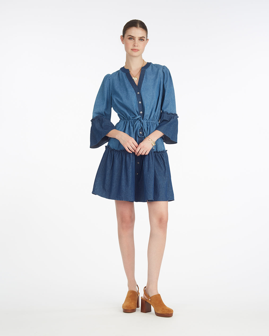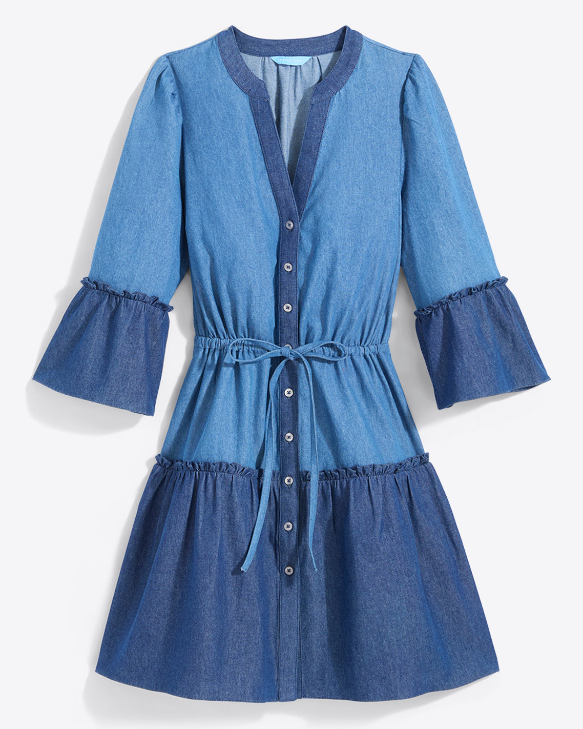 True blue. Cut from soft 100% cotton patchwork chambray and finished with fun, flattering details like bell-shaped sleeves and a self-tie belt, our Avery Shirtdress is as versatile as it is stylish. Wear it to work with clogs and a cardigan, to run errands with sneakers, or to dinner with a pair of heeled boots!