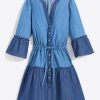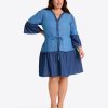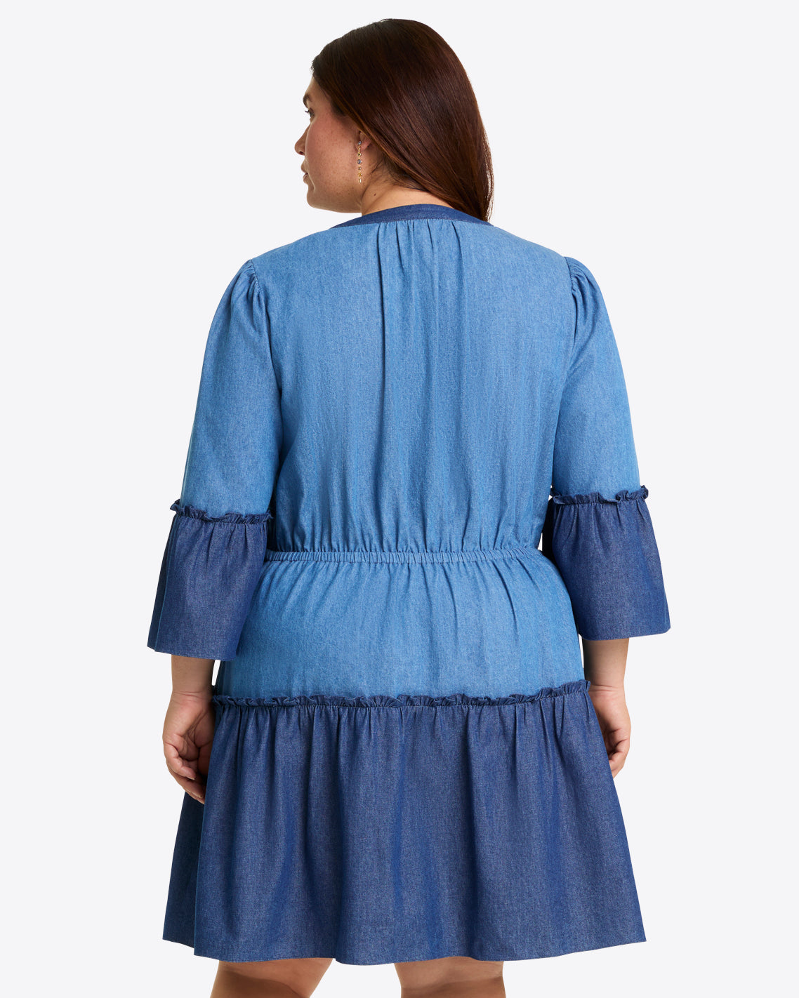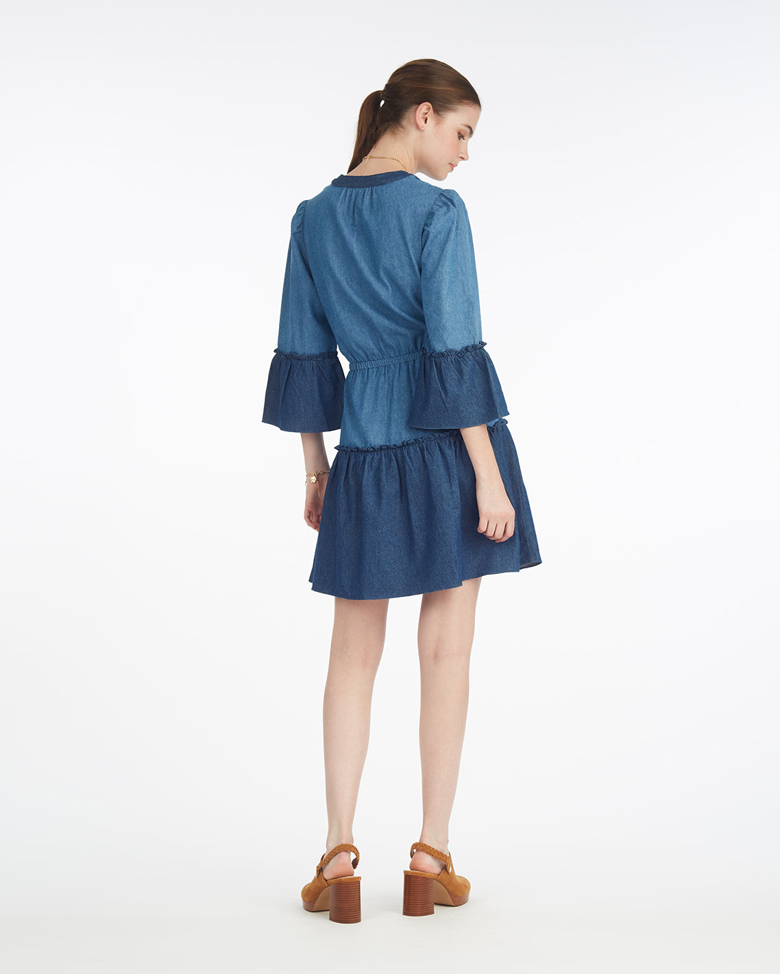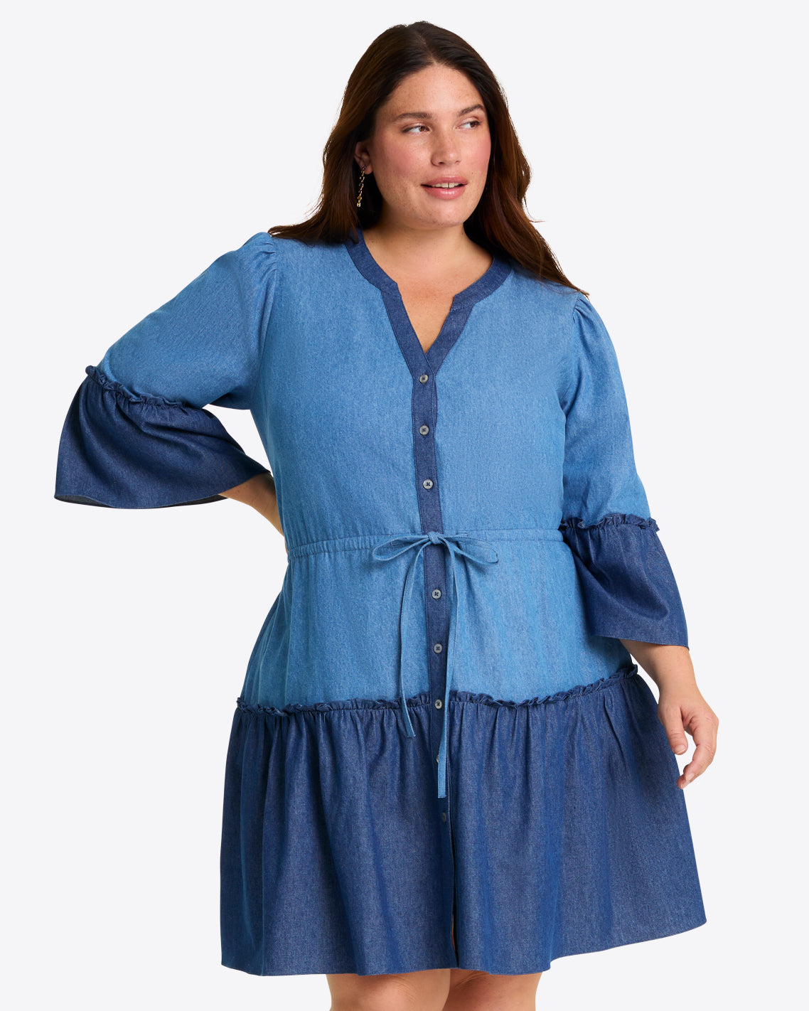 True blue. Cut from soft 100% cotton patchwork chambray and finished with fun, flattering details like bell-shaped sleeves and a self-tie belt, our Avery Shirtdress is as versatile as it is stylish. Wear it to work with clogs and a cardigan, to run errands with sneakers, or to dinner with a pair of heeled boots!