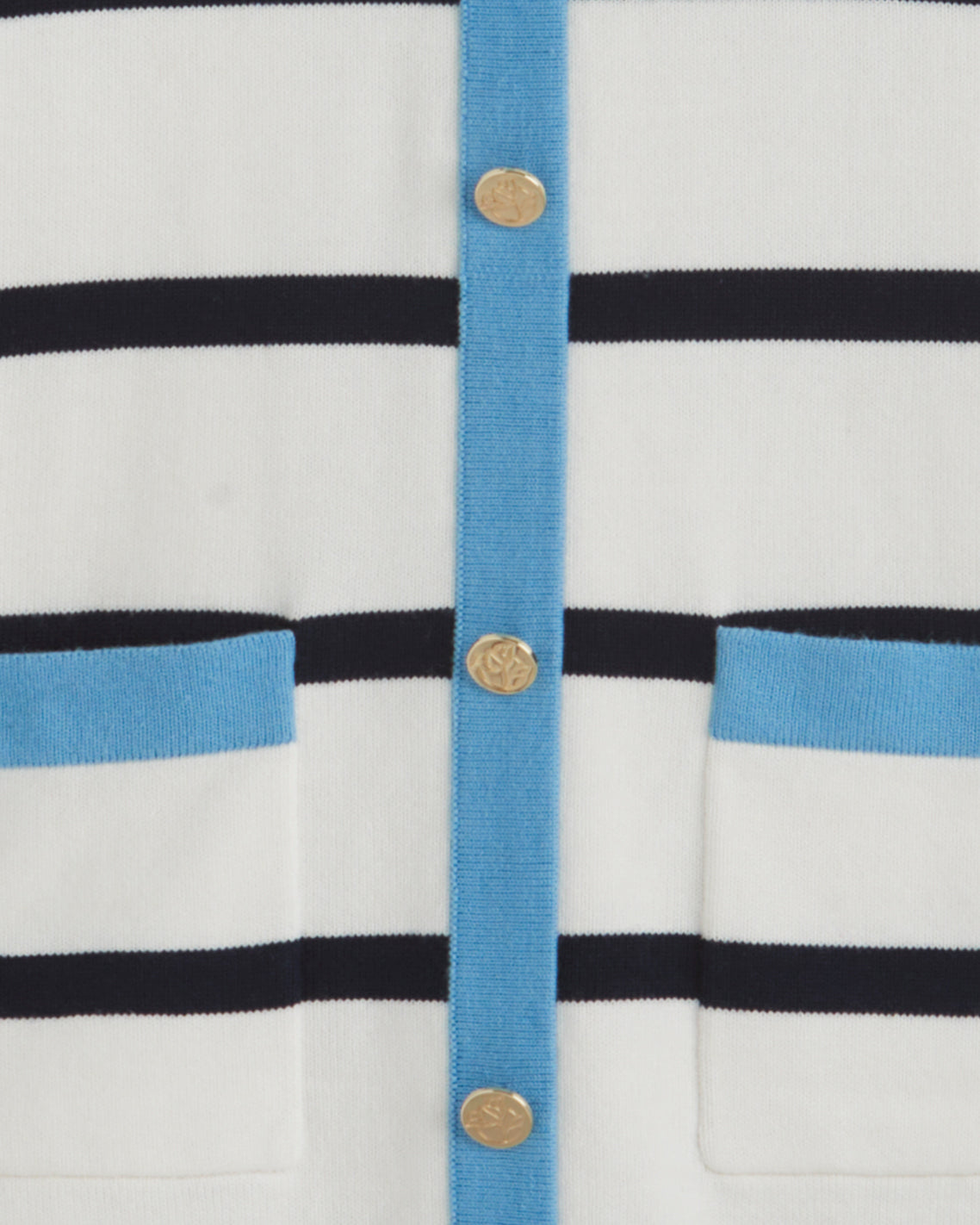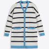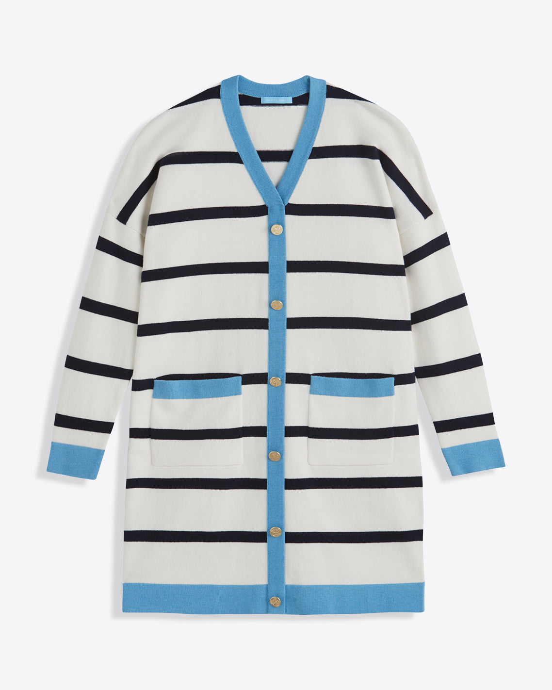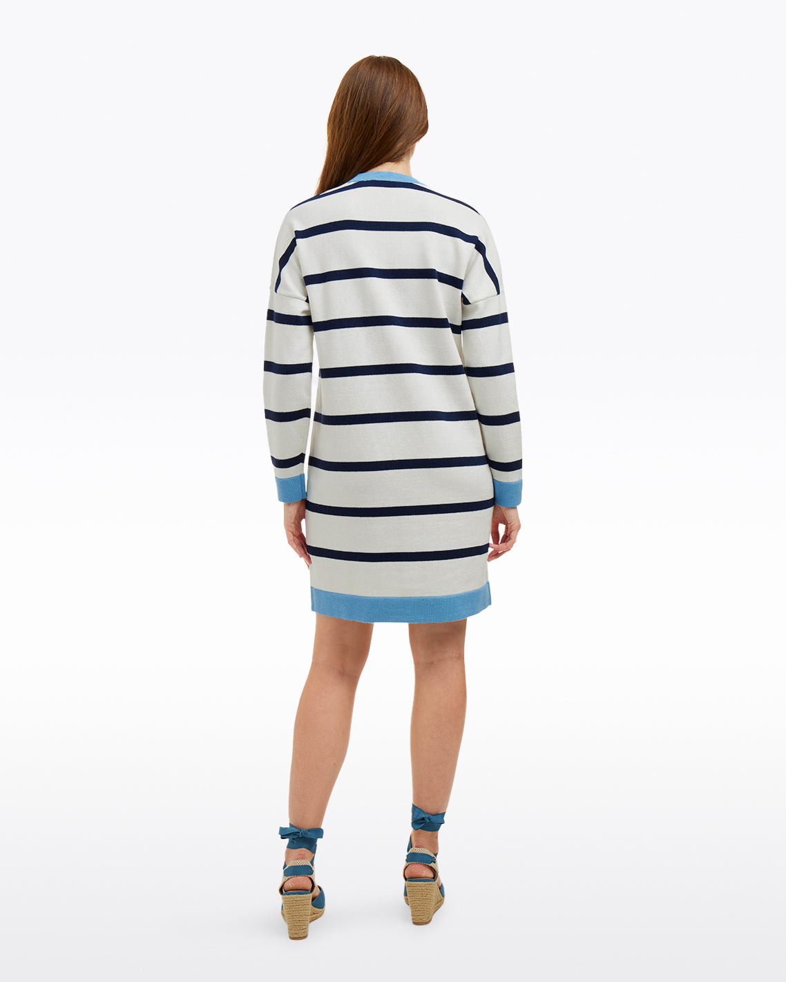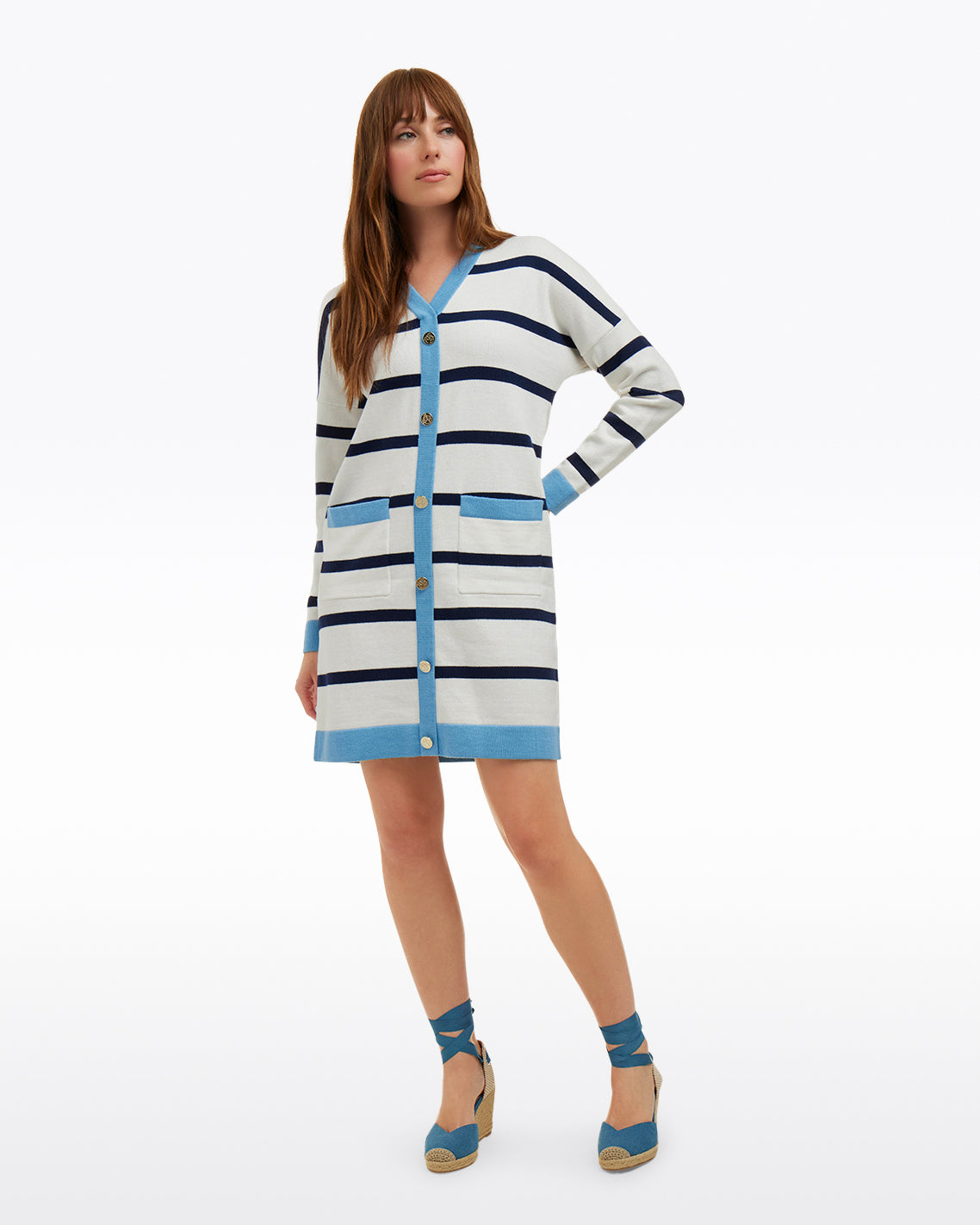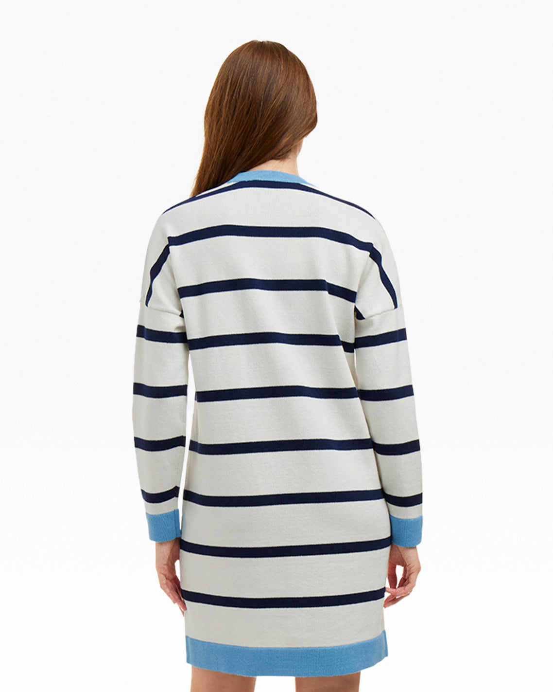 Show your stripes. Knit from a soft cotton-wool blend, Our Cassadee Cardigan Sweater Dress is as comfy as it is chic. Finished with a V-shaped neckline, contrast-colored edges and patch pockets, it has a classic look that’s perfect for work, weekend gatherings or whatever else you might have planned.