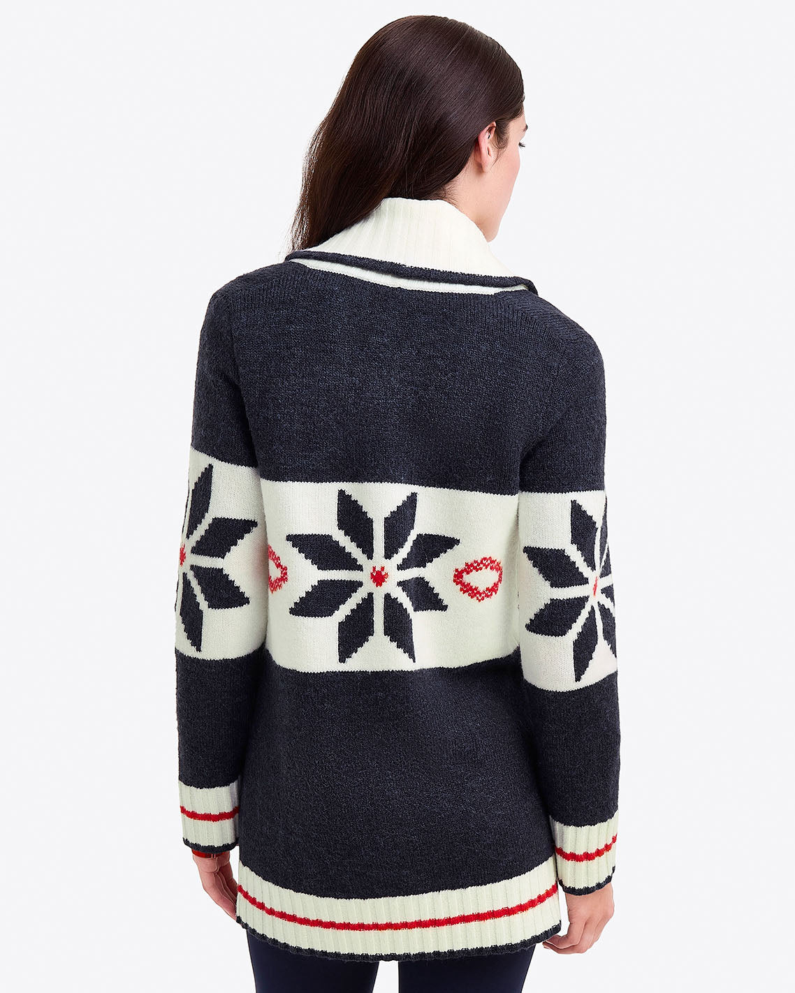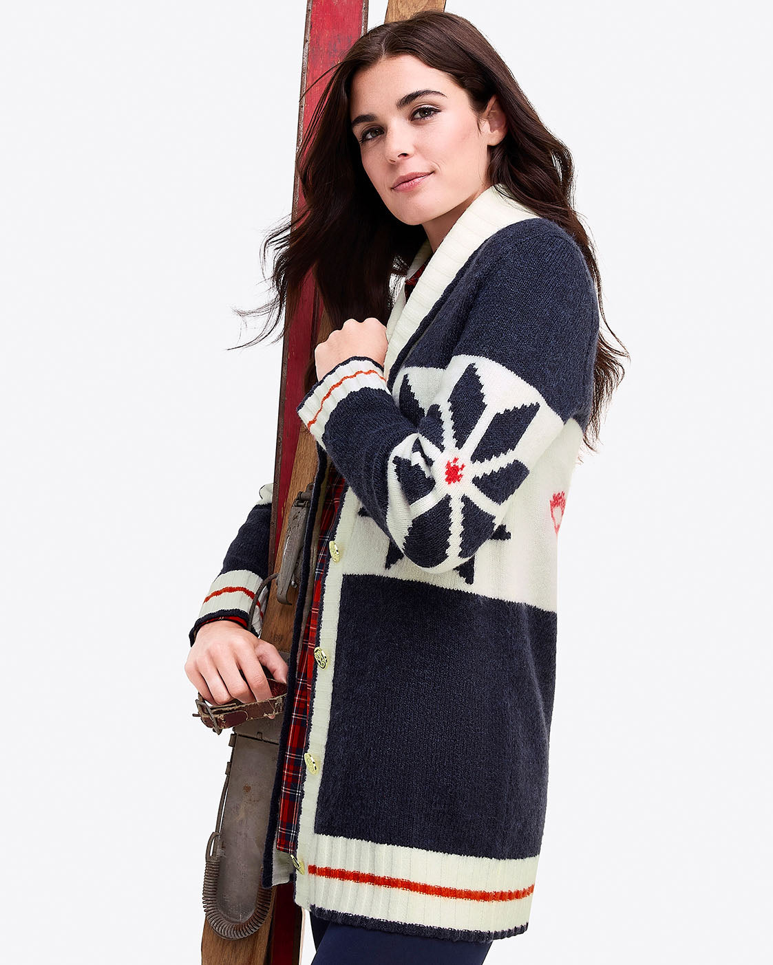 Aprés, anyone? Our Cozy Cardigan Sweater is knit from a wool blend and decorated with an old-school snowflake motif, making it perfect for fireside snacks, post-skiing happy hours and, of course, any other winter event.