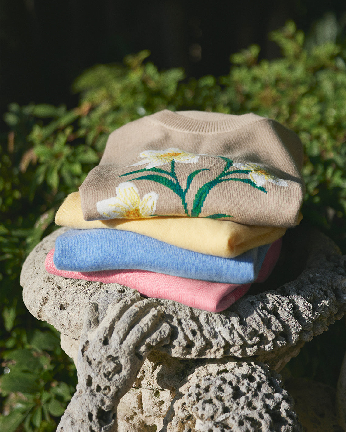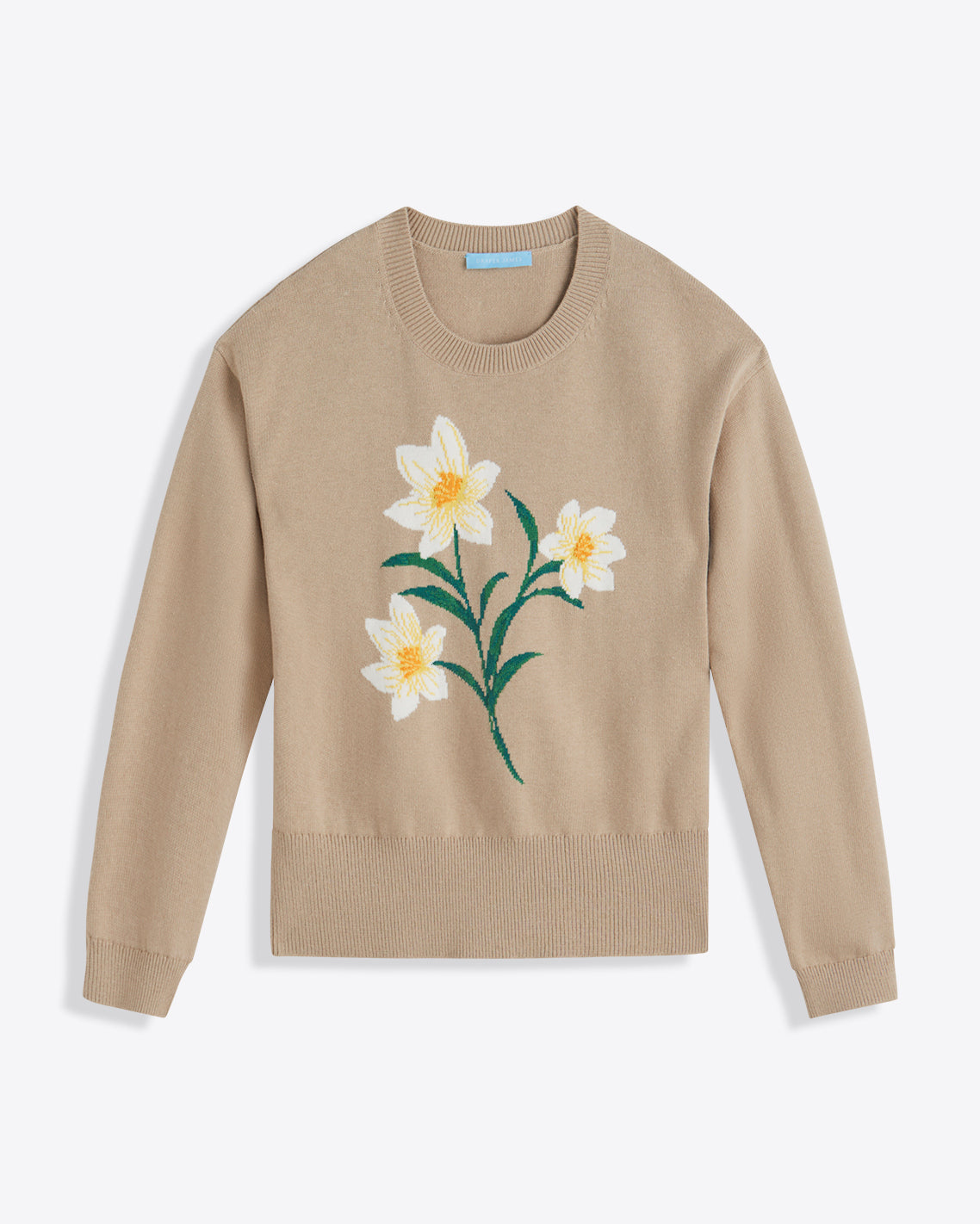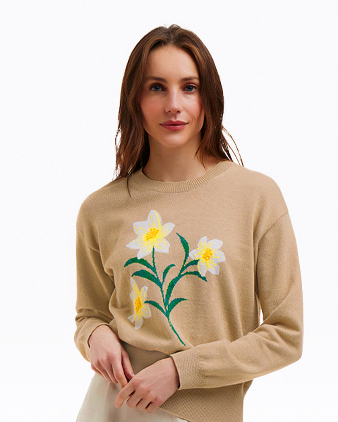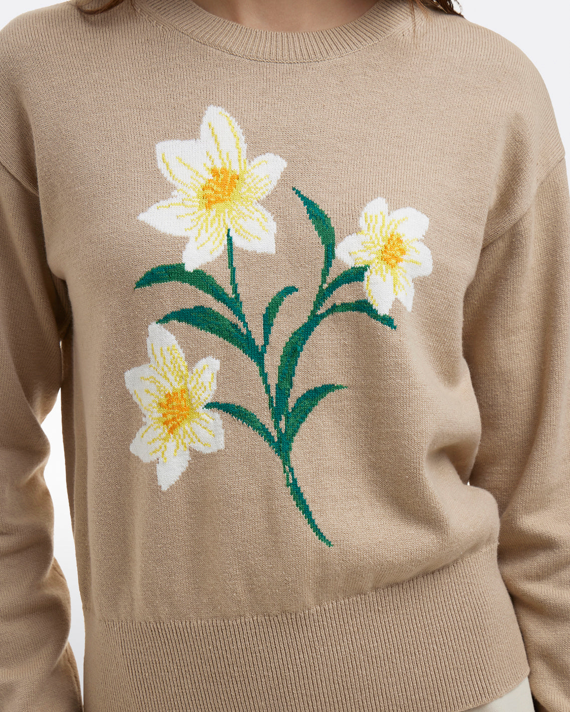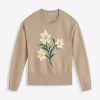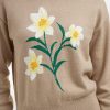 Spring flowers. Our Daffodil Crewneck Sweater is knit from a soft cotton-wool blend and finished with dropped shoulders and an embroidered stem and blossoms on the front. The overall look is uplifting but still polished, and a perfect match for your favorite jeans or pants.