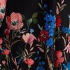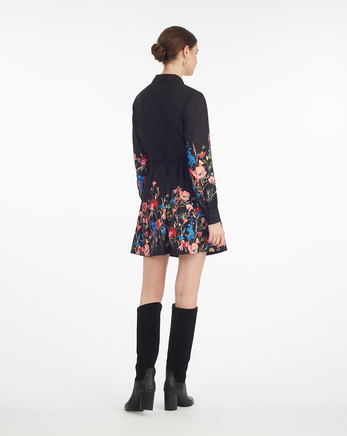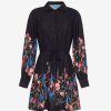 Bold blooms meet everyday ease in this feminine shirtdress. With floral cuffs and a border print that pops against classic black, it’s an effortlessly polished pick for day-to-dinner plans. The tie waist and mini length make it feel flirty yet refined.