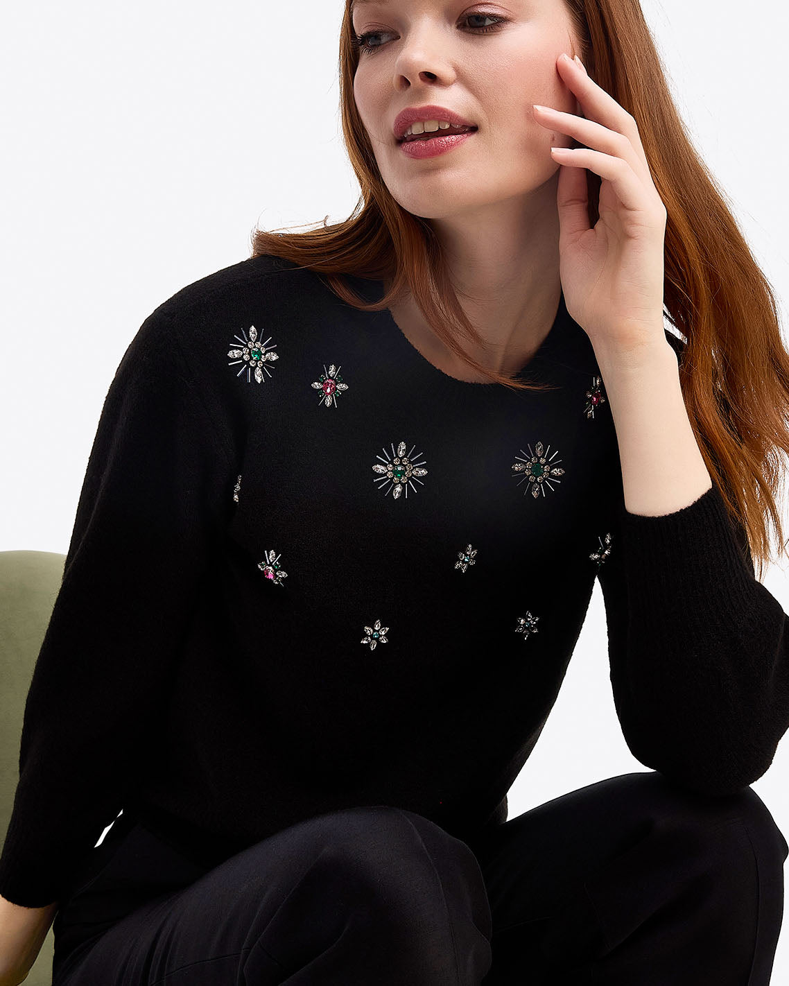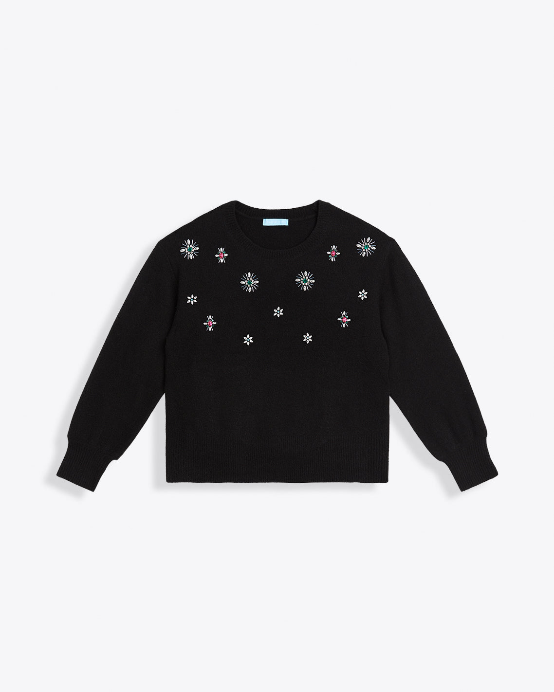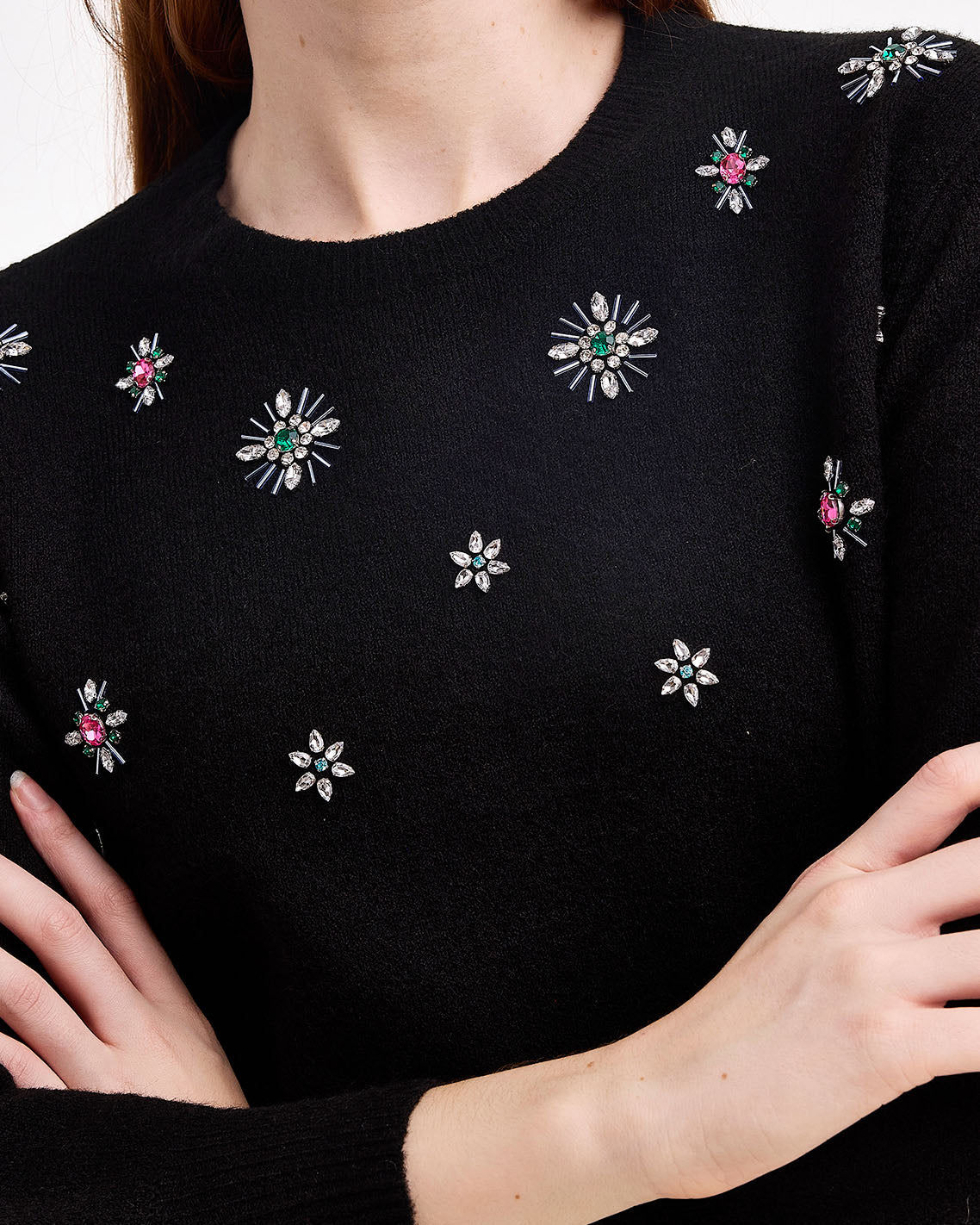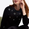 Sparkle plenty. Our Embellished Crewneck Sweater is knit from a cozy blend with the ideal amount of stretch and decorated with colorful gems, for a festive look that’s perfect for the holidays. Pair it with your favorite black pants or jeans and you’re ready to party!