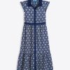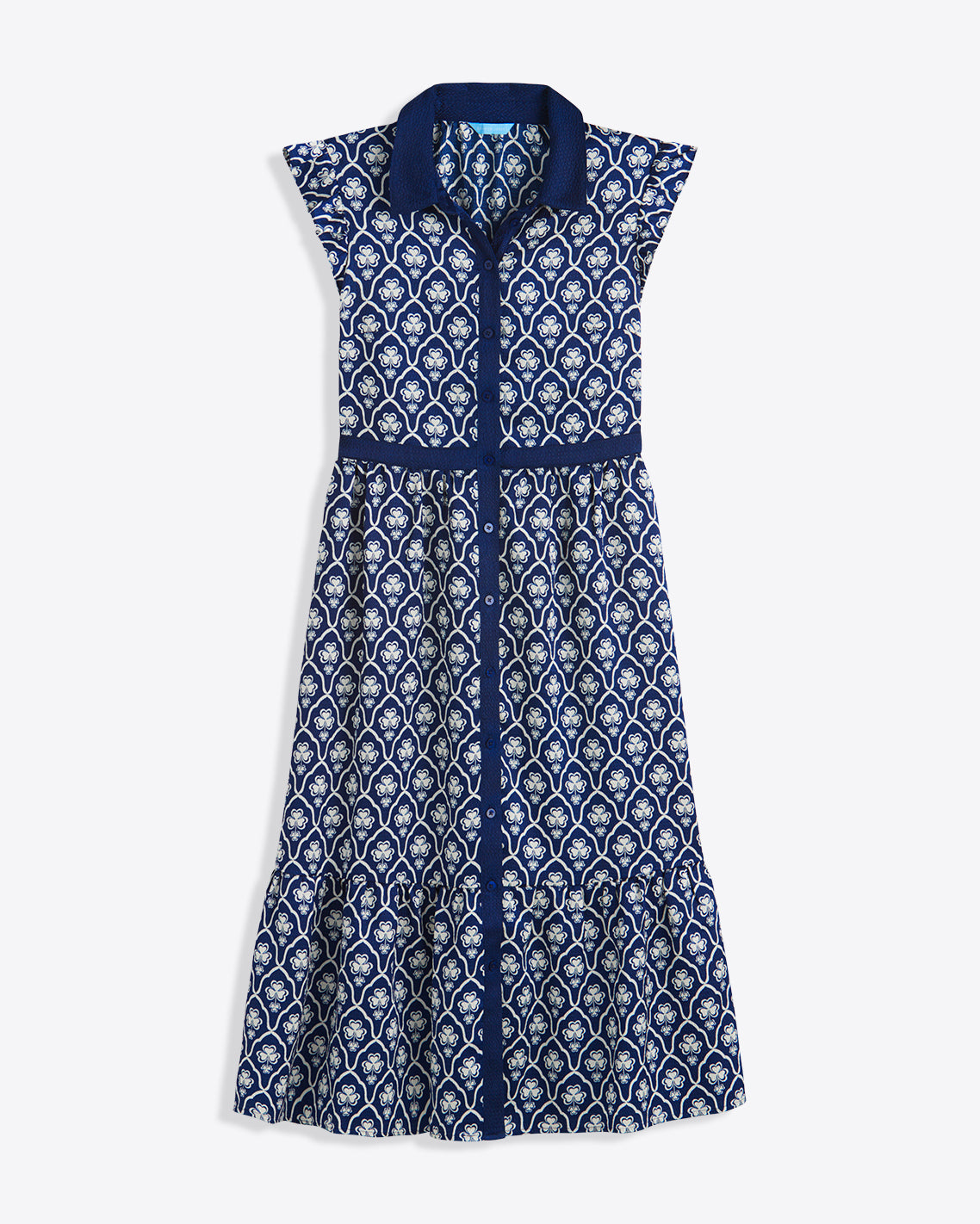 Button things up. Cut from printed hammered satin and finished with a contrasting collar and trim, our Emmylou Sleeveless Midi Shirtdress in Clover Field is a perfect, polished option for whatever you’re up to this season, from work meetings to weekend parties.
