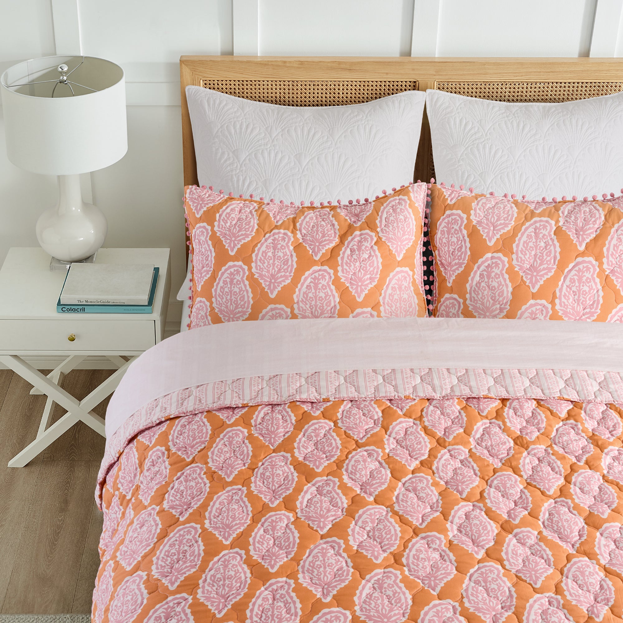Whether you’re decorating your first dorm room or refreshing a cozy bedroom at home, this vibrant quilt set blends bold color with sweet, feminine details.