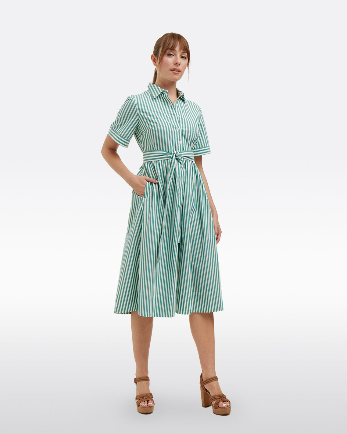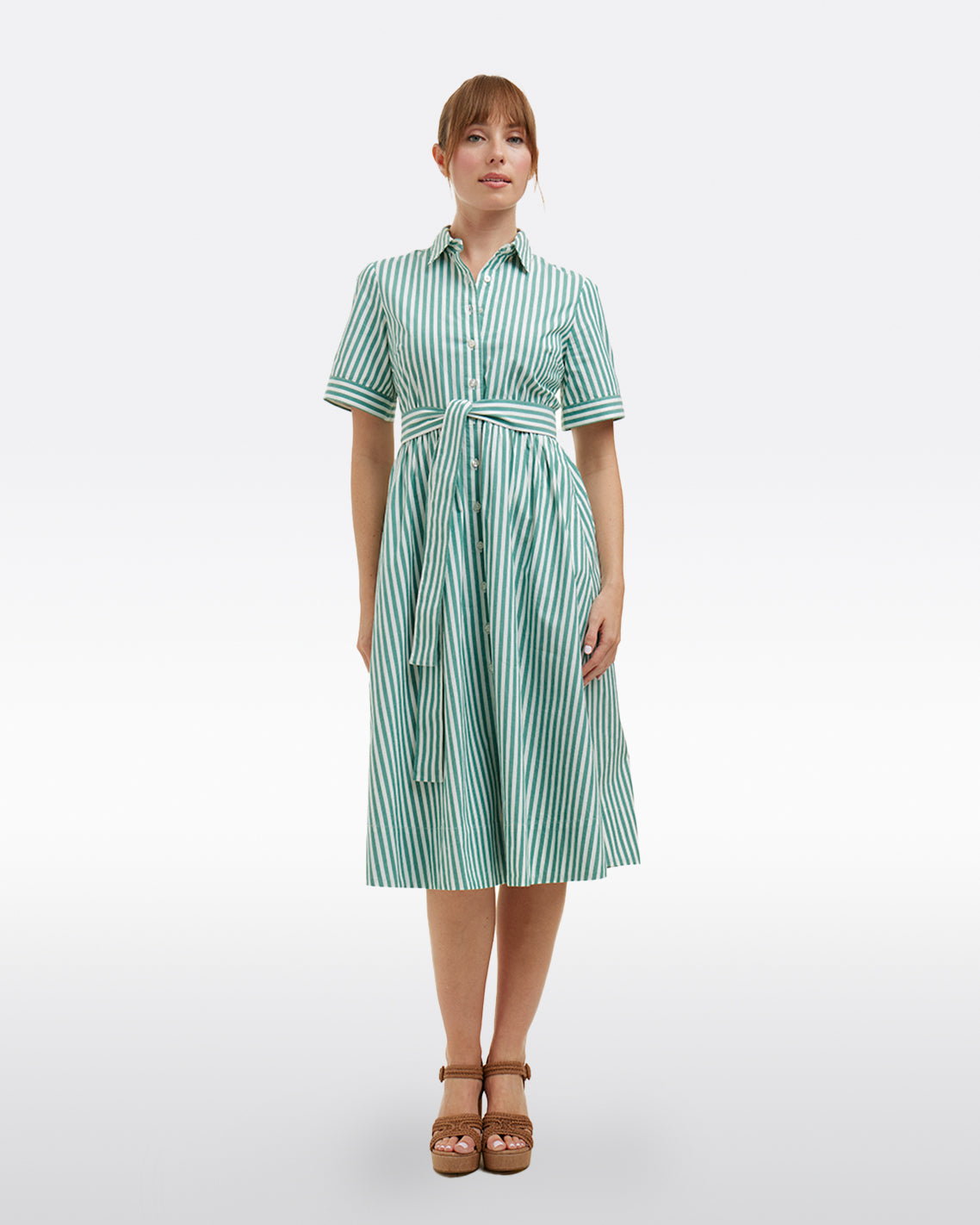 Green light. Cut from a striped cotton with the perfect amount of stretch and finished with a self-belt, our Jordan Green Stripe Midi Dress is perfect for everything from a work meeting to a weekend party. Pair it with flats and studs for the former, then switch to high heels and hoop earrings for the latter. Either way, you’ll stand out!