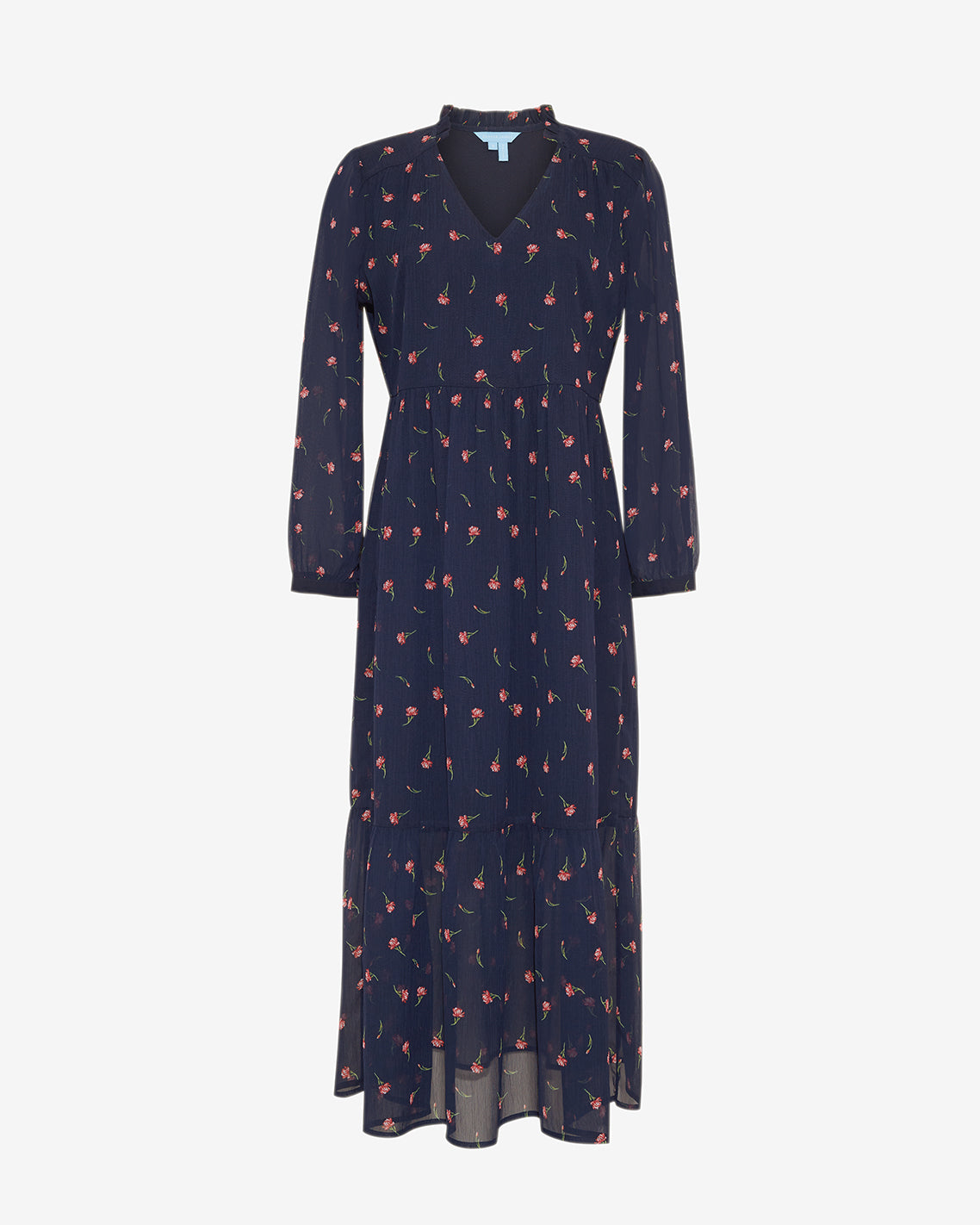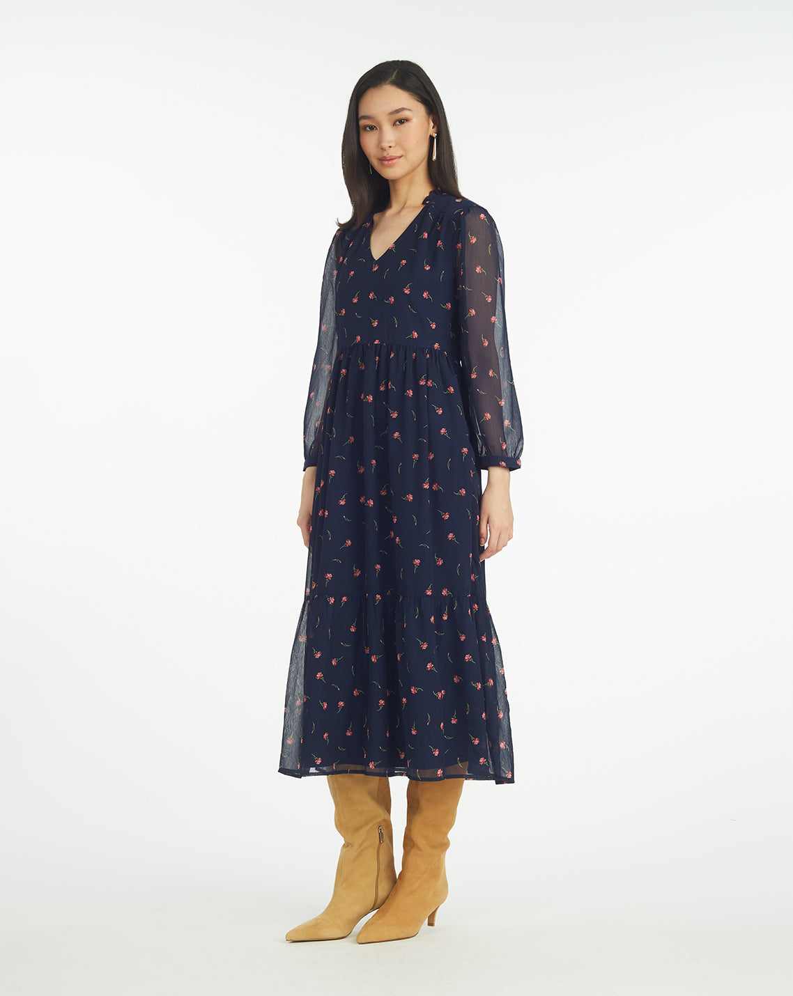 The Katie Midi Dress in Autumn Flowers Crinkle Chiffon is a graceful, go-anywhere favorite with timeless charm. Featuring a soft V-neckline, sheer blouson sleeves, and a breezy tiered skirt, this silhouette flows effortlessly from day to evening. The delicate floral print adds a touch of whimsy, while the midi length and lightweight feel keep it endlessly wearable. Just add boots or block heels for a look that’s feminine, flattering, and fall-ready.