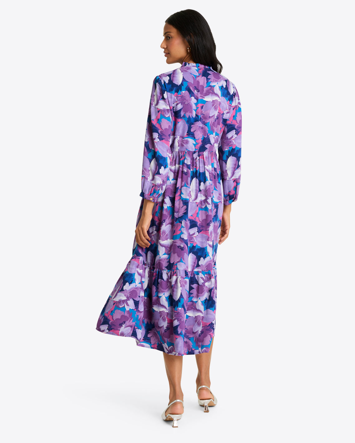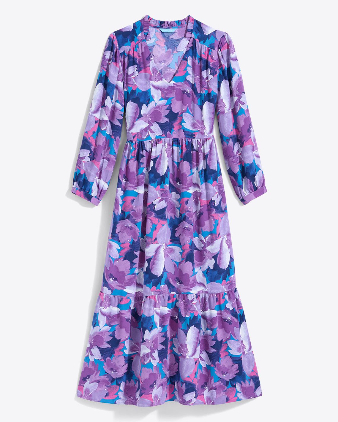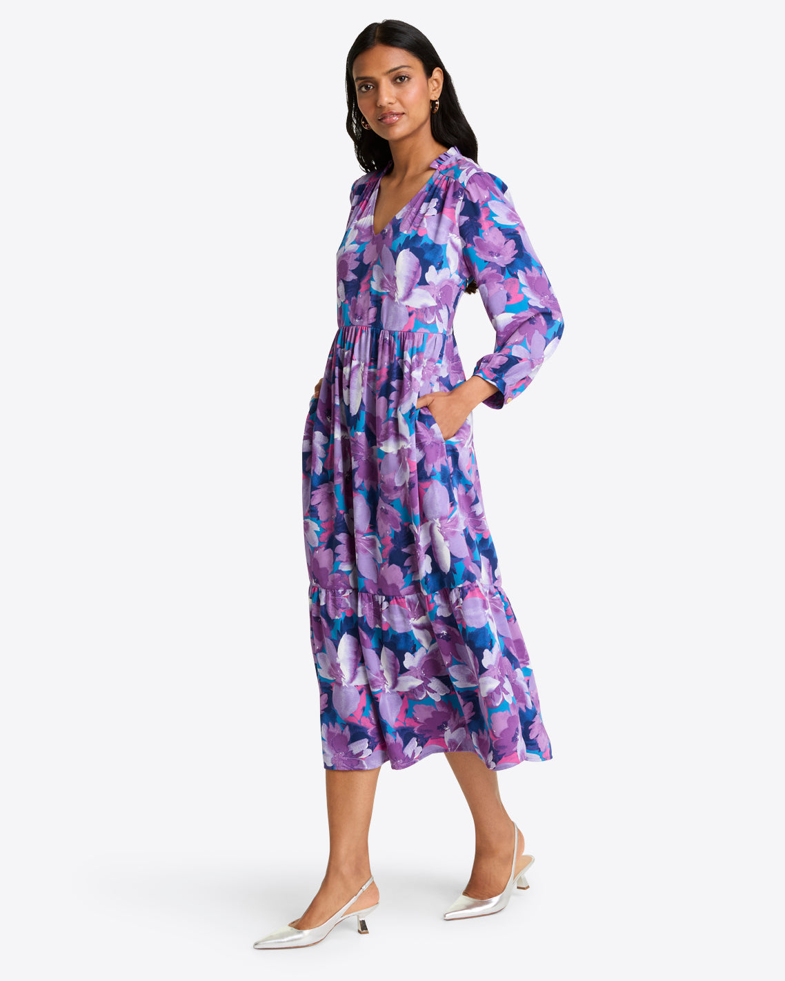 Purple reign. Our Katie Midi Dress is cut from a bold floral fabric, so it’s a great way to make an impact. Wear it to work with a cardigan and boots, then switch to high heels for an evening out!