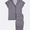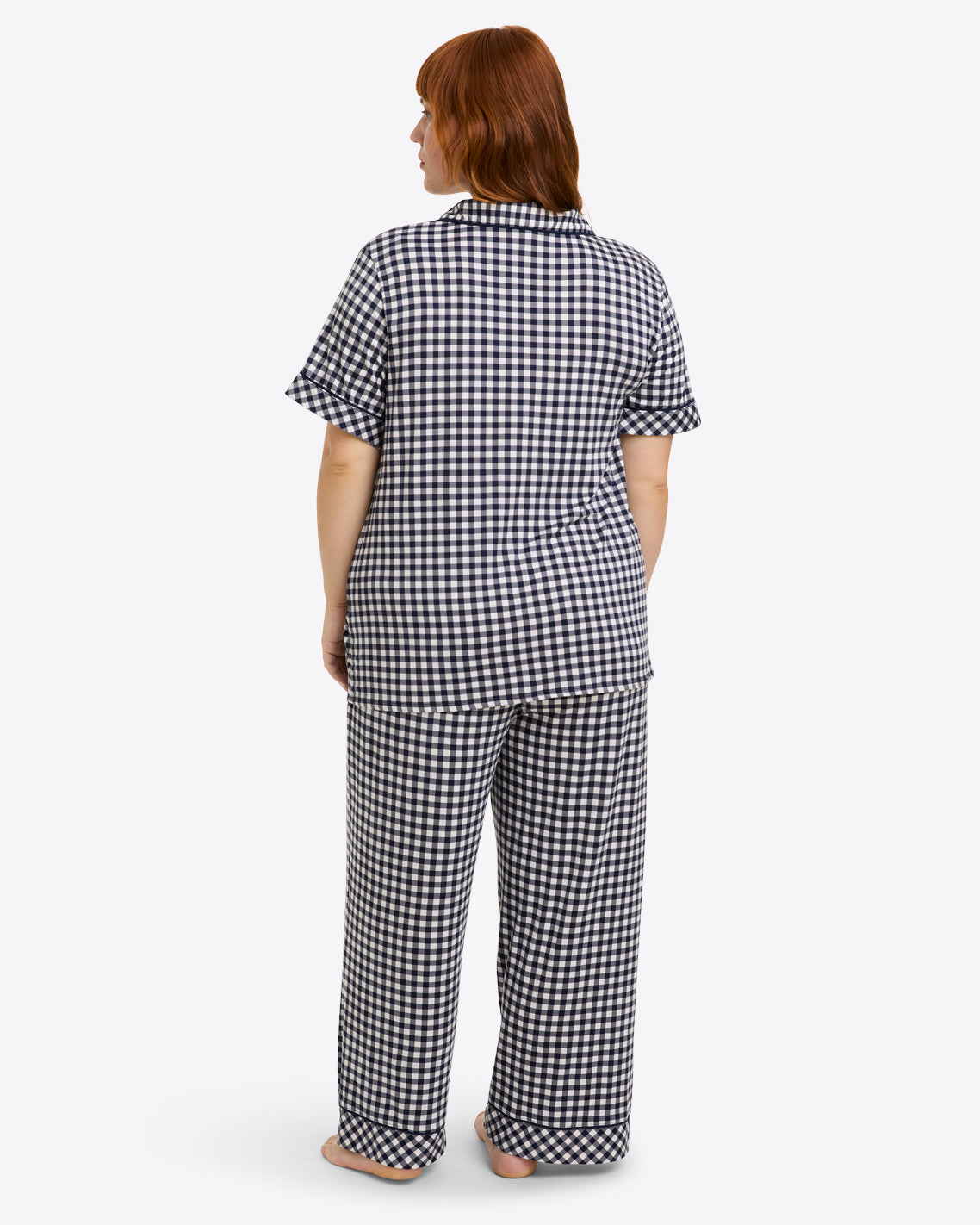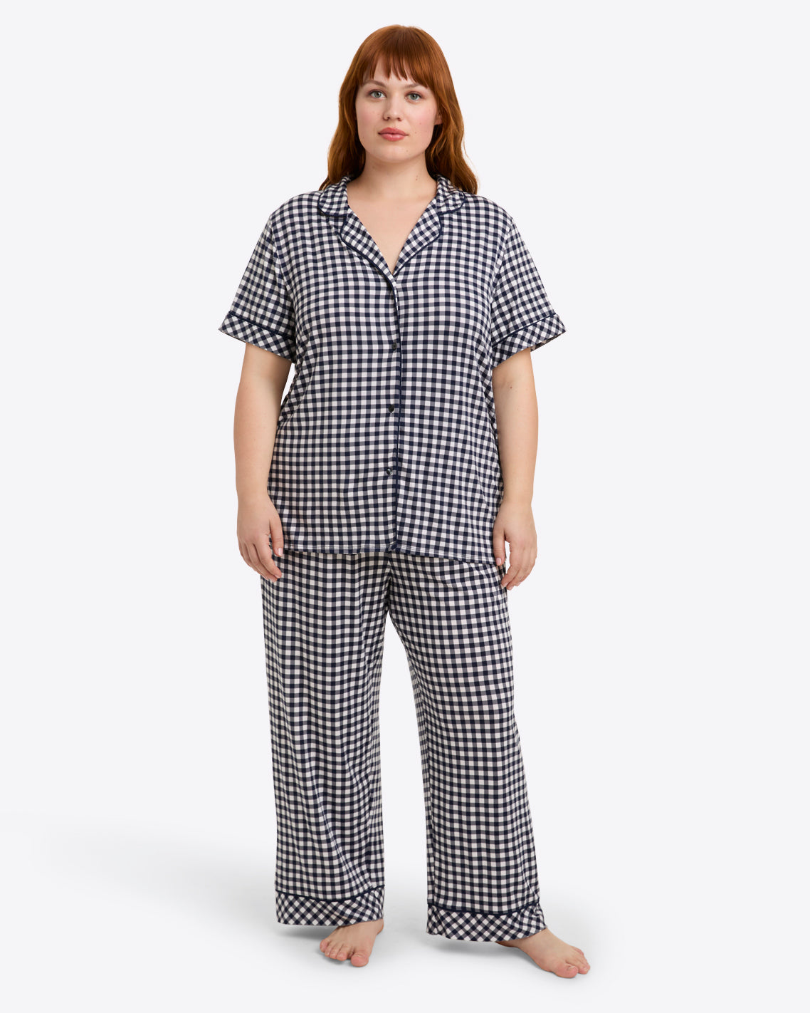 Pajamas must be three things: soft, comfortable, and full of personality. This set does it all — complete with our signature gingham print, functional button front top, contrast piping, and elastic waist bottoms. Sweet dreams!
