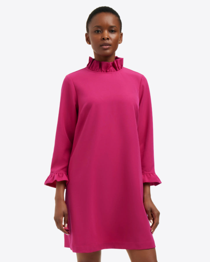 Give ’em short shift. Our Lindsay Shift Mini Dress is cut from a heavy crepe with the perfect amount of stretch and finished with a ruffled mock turtleneck and cuffs. Wear it with clogs and a pair of dangly earrings to work, dinners out or whatever else you have planned.