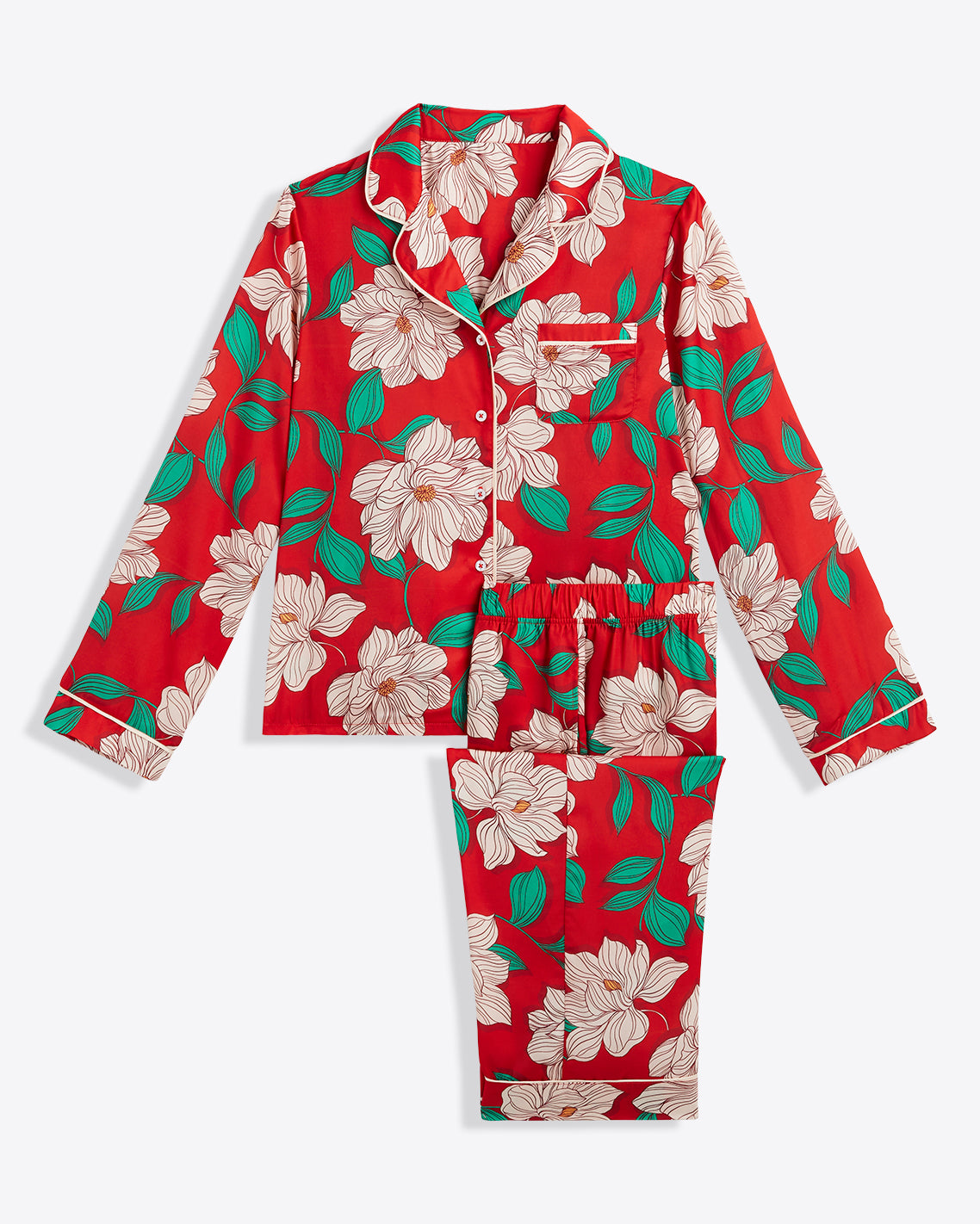 Good in bed. Our Long Sleeve Pajama Set is cut from a silky satin with a bold floral print, so it’s chic (and comfy) enough to wear all morning.
