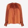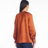 Our hammered satin blouse is all about understated drama. Designed with a gathered crewneck, graceful drape, and softly bloused sleeves finished with covered buttons, it’s the kind of top that makes even denim feel dressy. The rich rust hue gives it warmth and depth—perfect for fall and holiday, but equally striking year-round. Style it tucked, half-tucked, or loose—it’s polished no matter what.