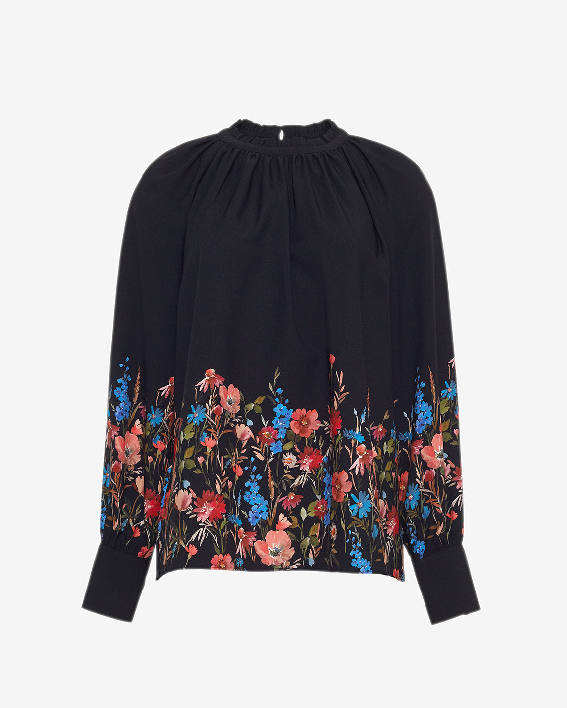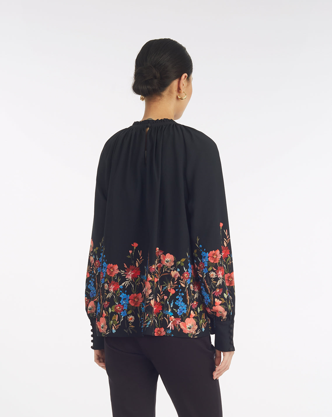 Meet your new favorite statement top. With its relaxed silhouette, gathered neckline, and vivid floral border, this blouse brings just the right touch of drama to everyday dressing. Tuck it into tailored pants or let it flow over denim—either way, it’s a standout.