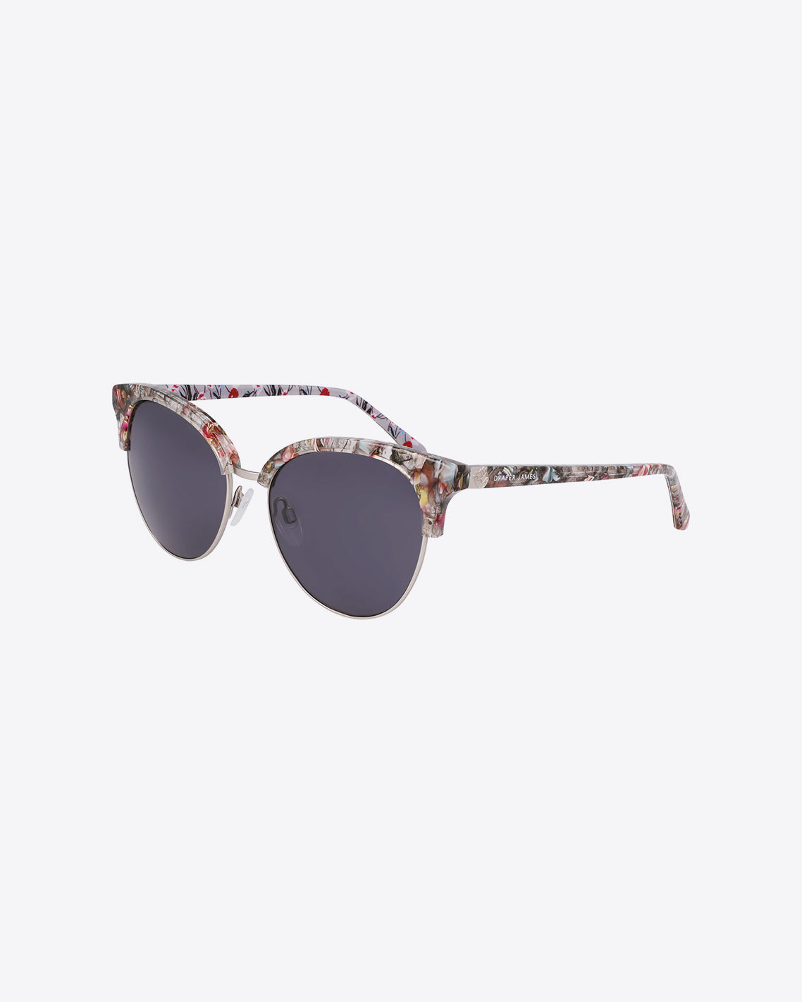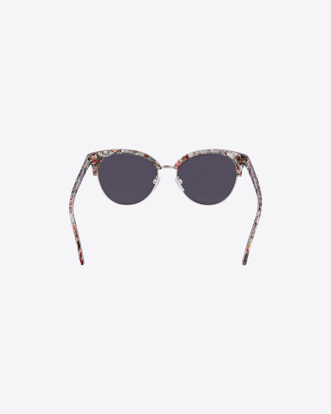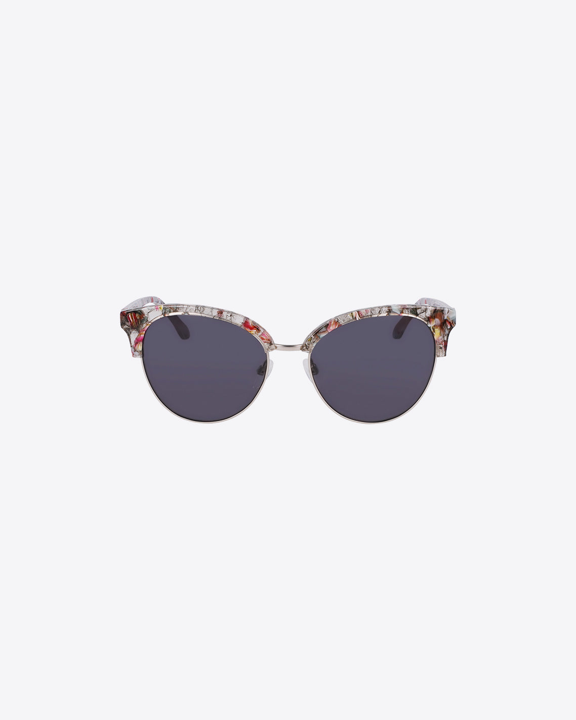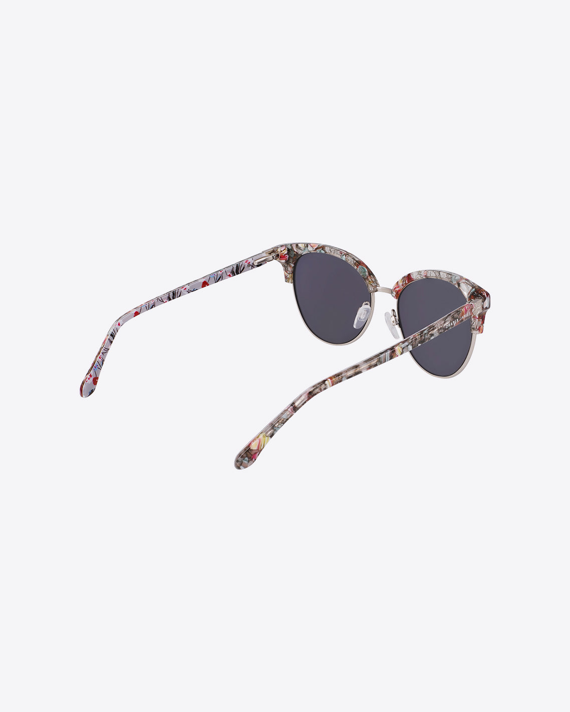 - Smoke tortoise frame front to a satin silver metal rim with smoke tortoise and floral printed temples