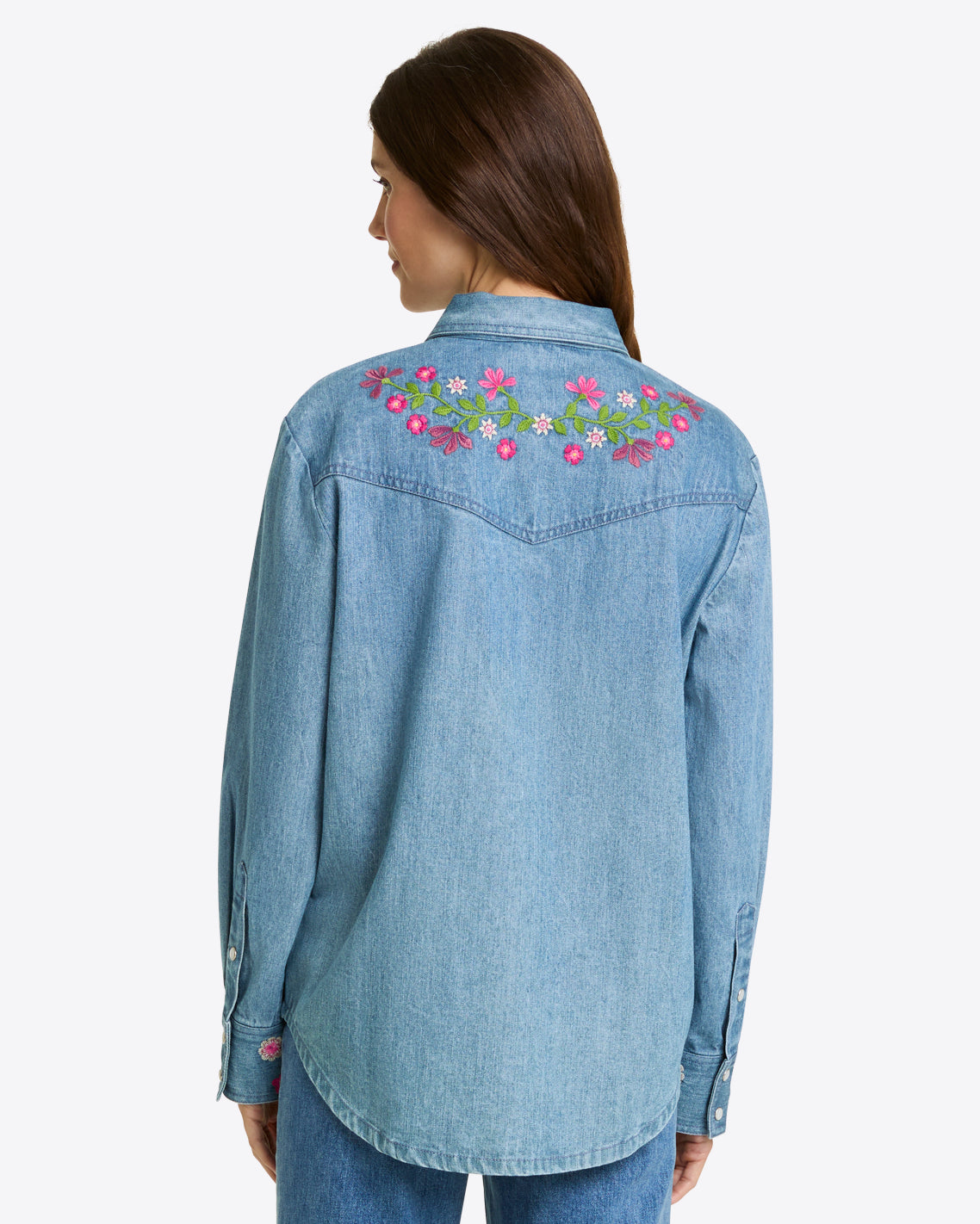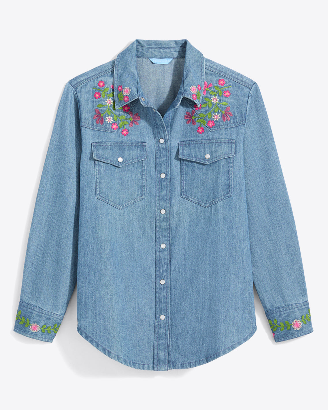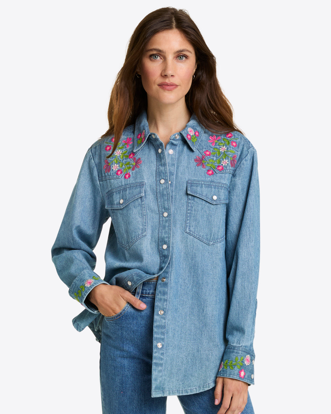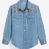 Nice threads. Our Lynn Embroidered Long Sleeve Top is made from 100% cotton denim and finished with pretty embroidered flowers at the shoulders, for a look that’s casual, comfortable and cute. Wear it with your favorite jeans for a head-to-toe denim look.