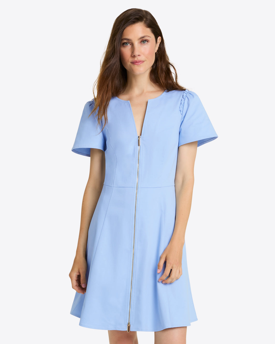 Come full circle. Our Mae Love Circle Dress is a new take on our iconic Love Circle silhouette, made famous by Reese herself. This version is constructed from a structured cotton with the perfect amount of stretch and features a cool two-way zipper in the front. Try it with high heels on your next desk-to-dinner day!