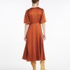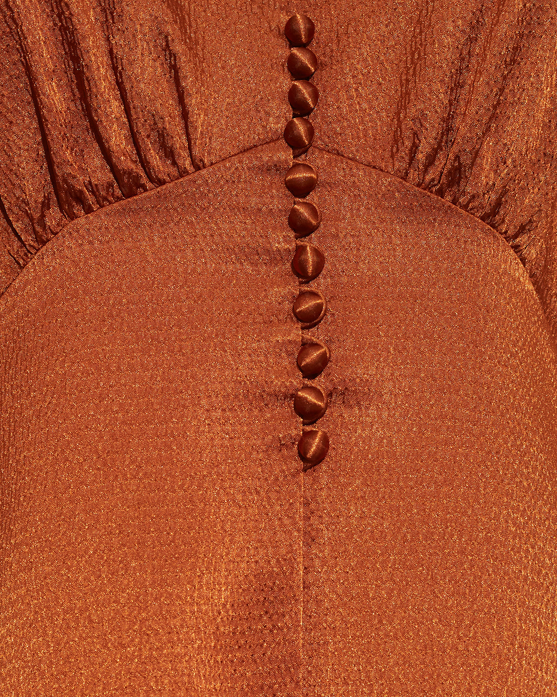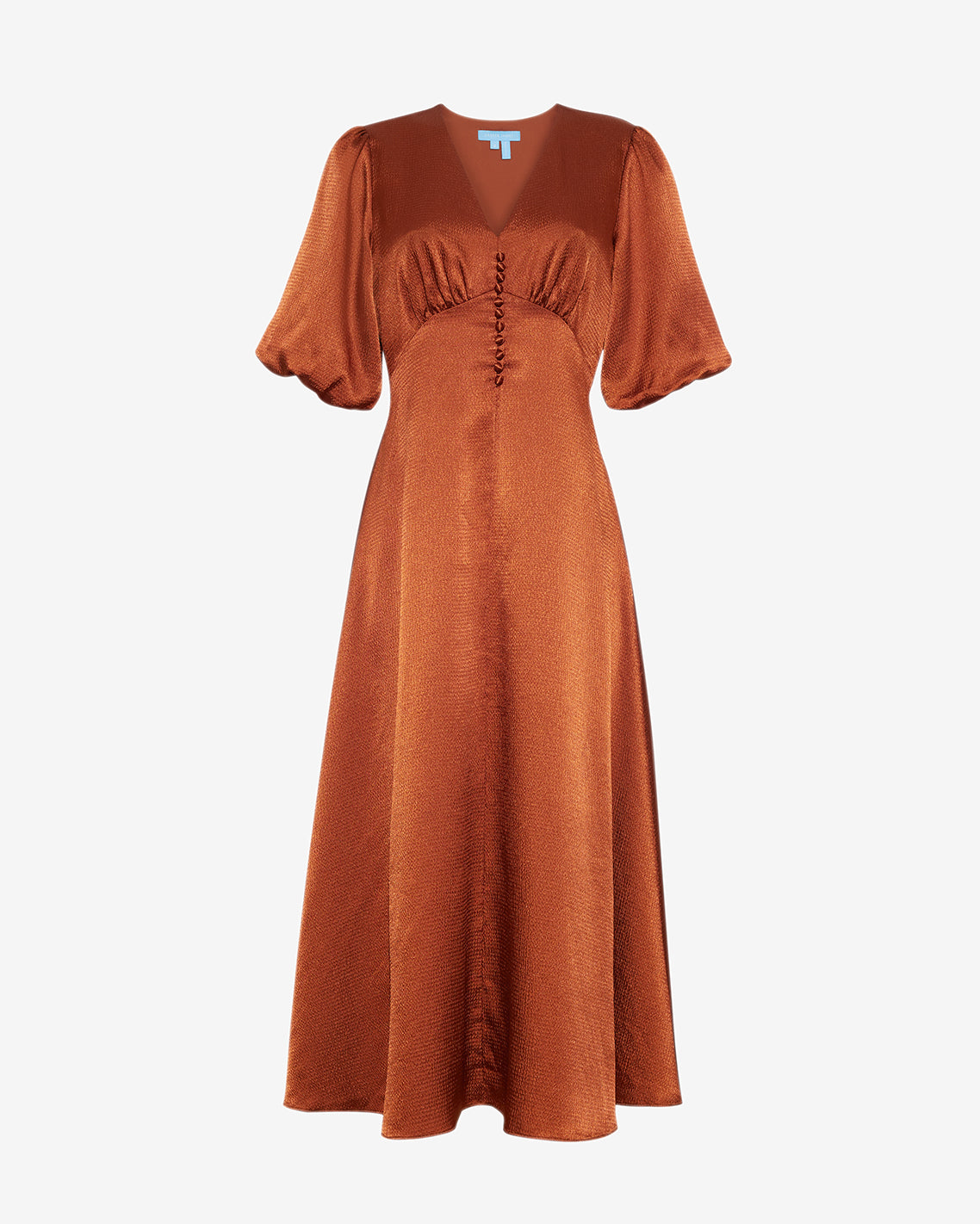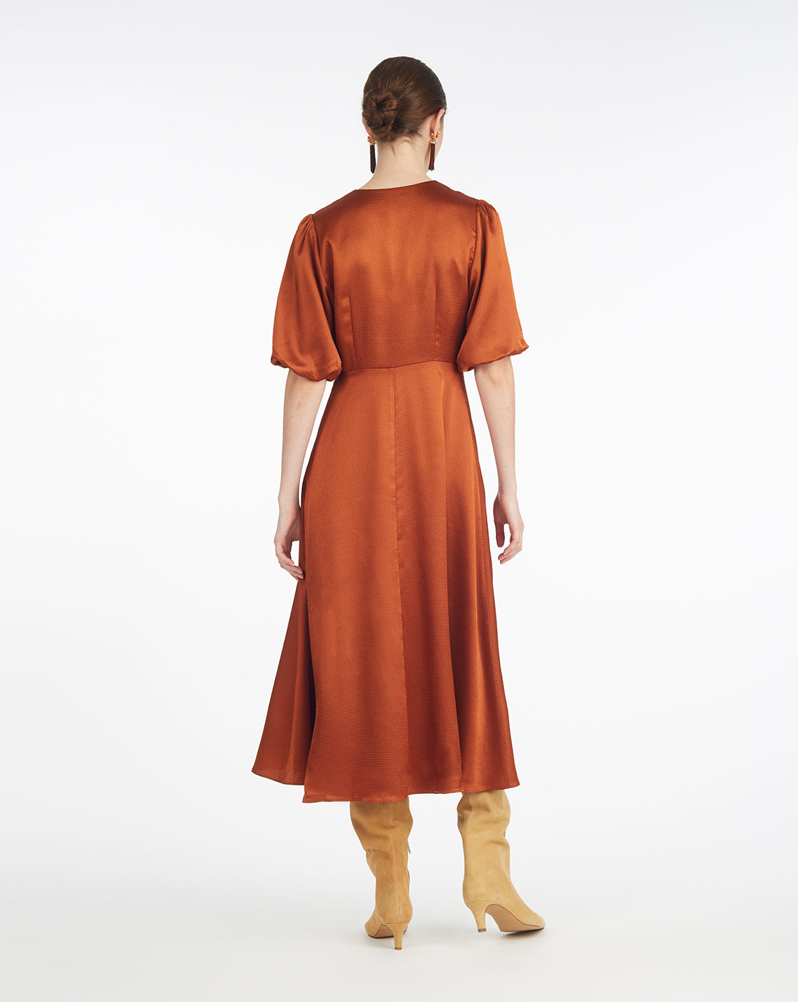 Our Maisy Midi Dress in hammered satin is a true closet charmer—cut in a rich, rust tone that flatters every skin tone and transitions beautifully from day to evening. A deep V-neckline, elegant covered buttons, and puff sleeves bring in a soft, romantic silhouette, while the midi length keeps it timeless and wearable. Whether you’re heading to a harvest dinner, a fall wedding, or a dressed-up day in town, Camille brings effortless elegance with just the right touch of Southern grace.