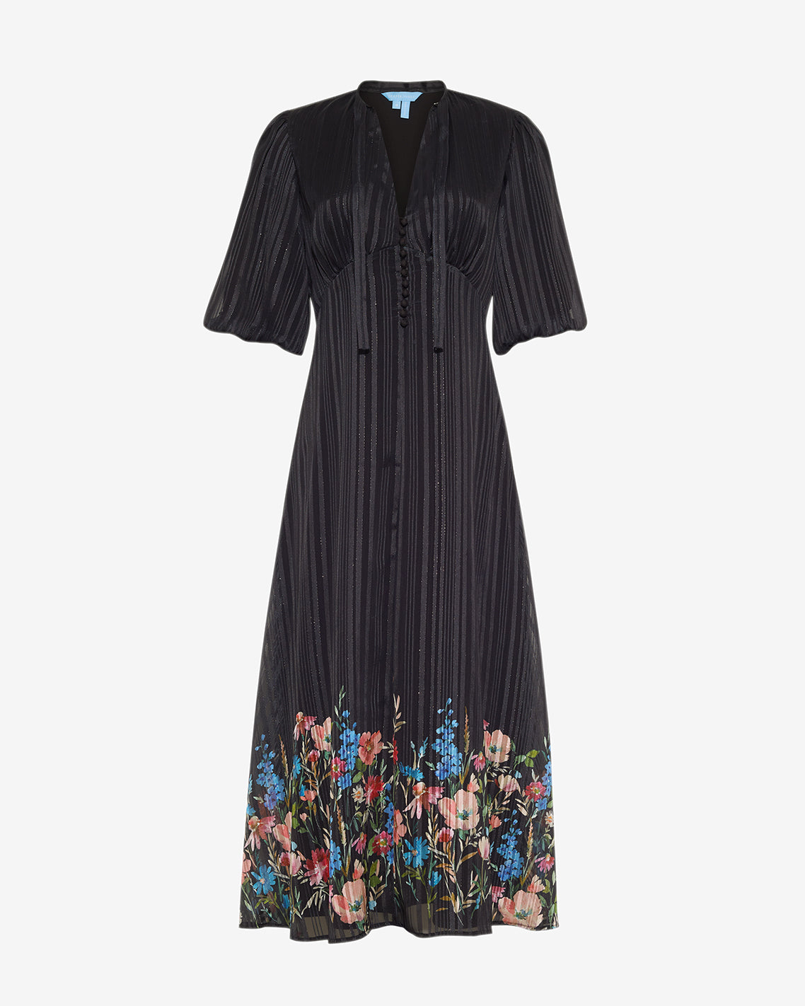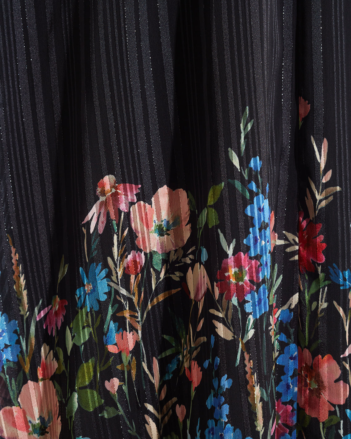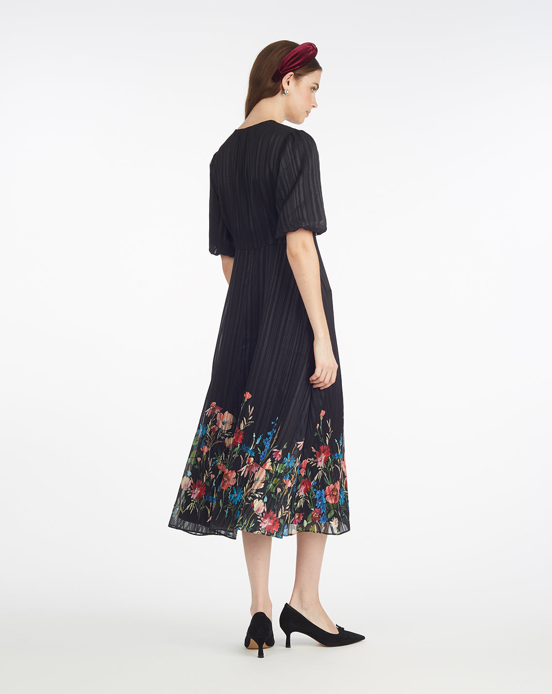 A dress made to turn heads—this pleated midi features a dreamy floral border that feels like a garden in motion. The V-neckline, covered buttons, and floaty sleeves add a romantic finish to the elegant silhouette. Perfect for weddings, soirées, or any moment you want to feel extra special.