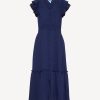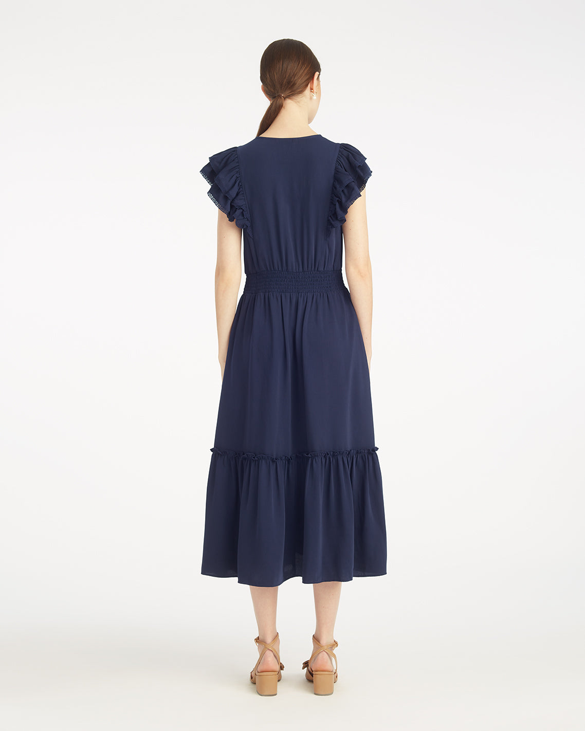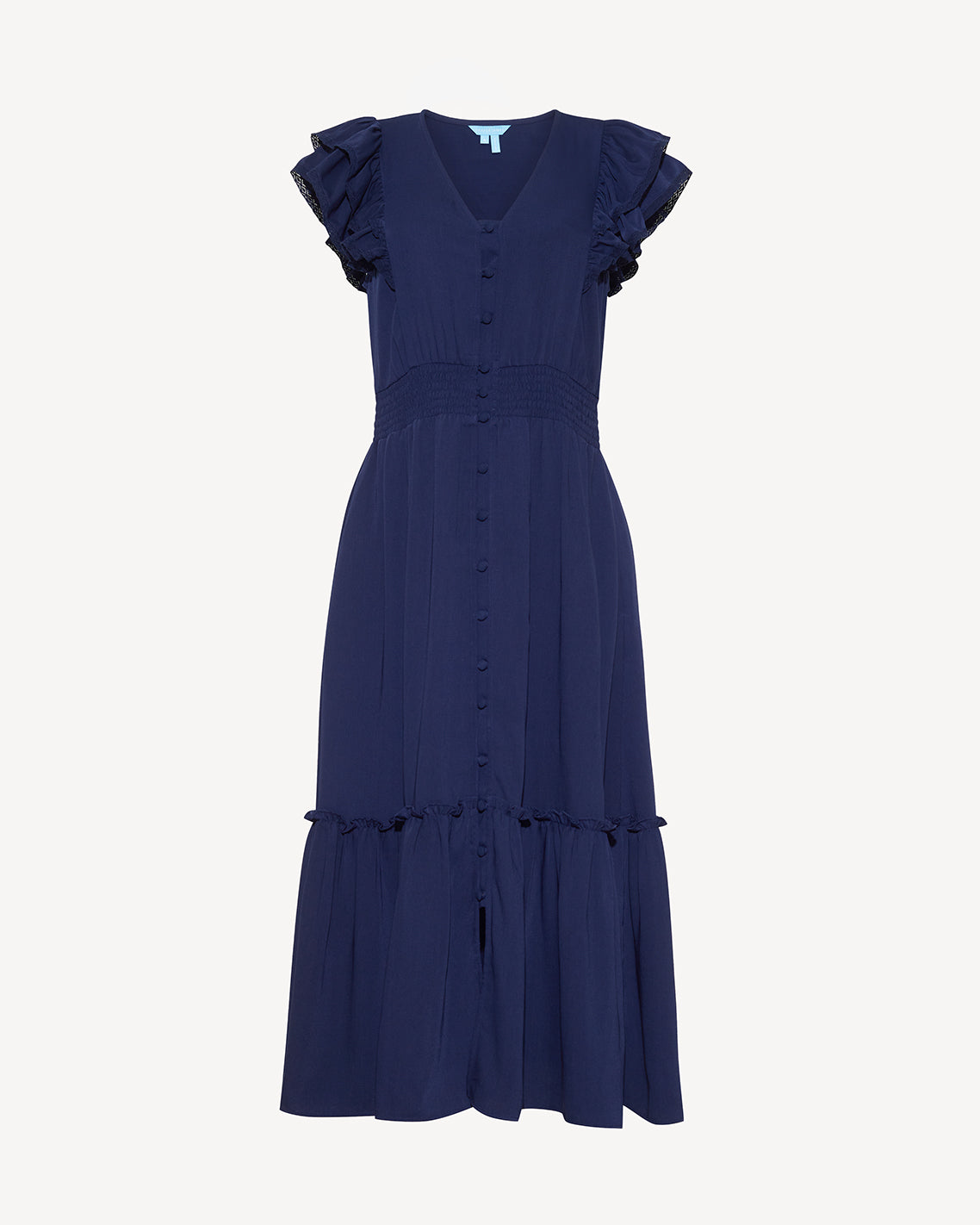 Ruffles up. Our Meg Midi Dress in drapey crepe is finished with flattering details like a V-shaped neckline and smocked waist. It’s a great party dress — just add heels! — but will also work for daytime with flats and a jean jacket.