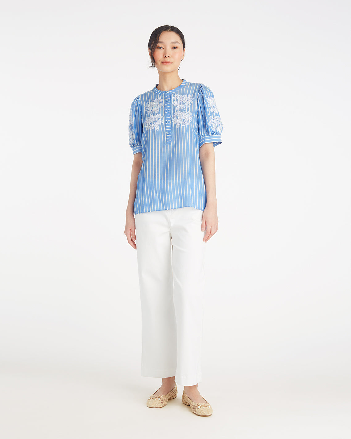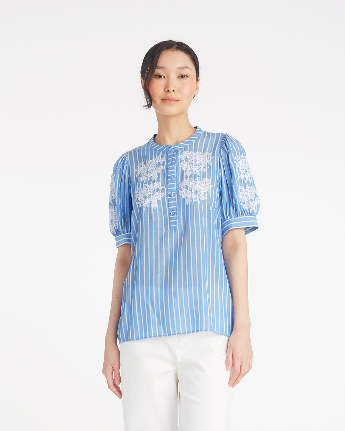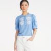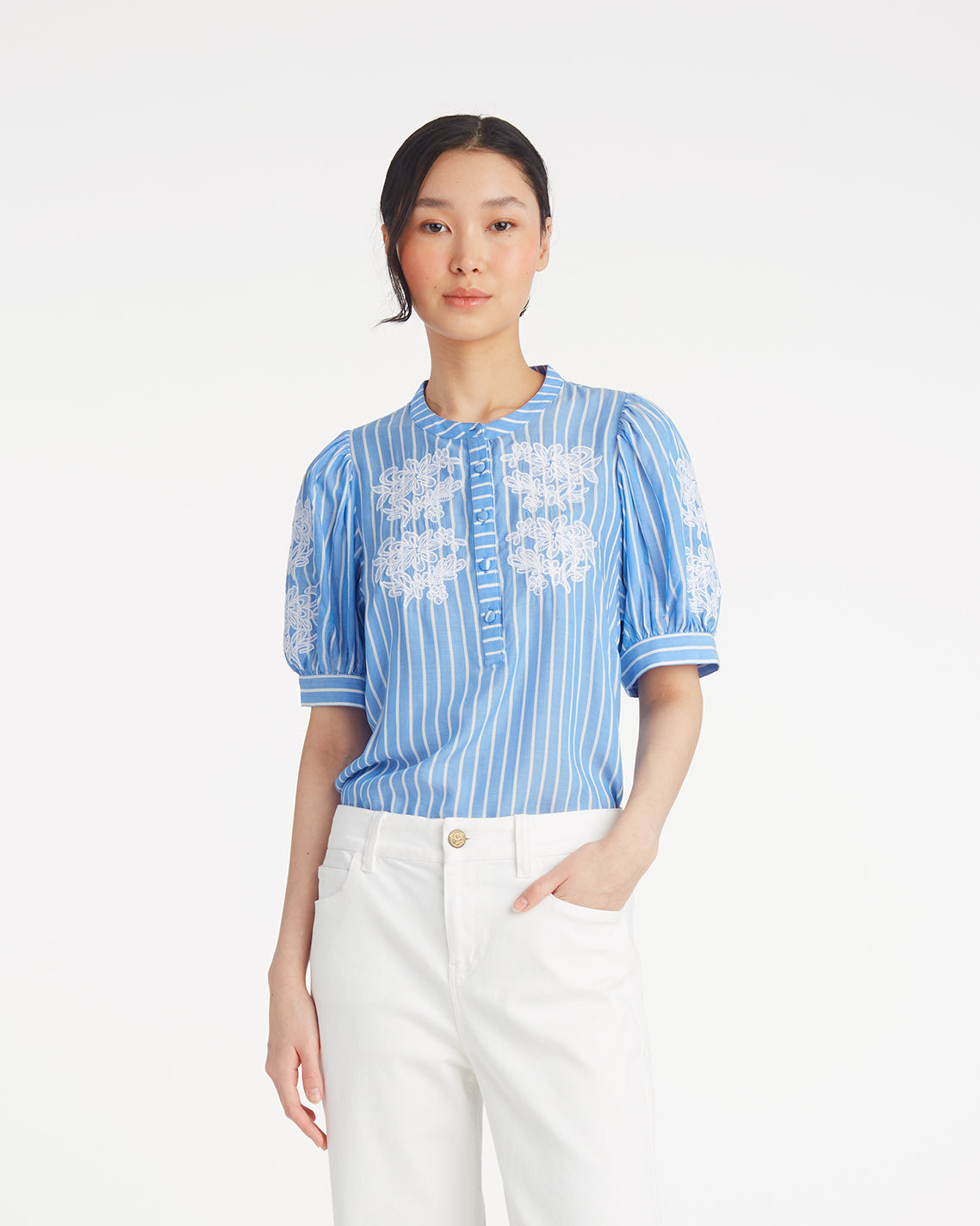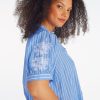 Draper James Women’s Puff Sleeve Top With Floral Embroidery | Blue Stripe Floral Embroidery