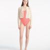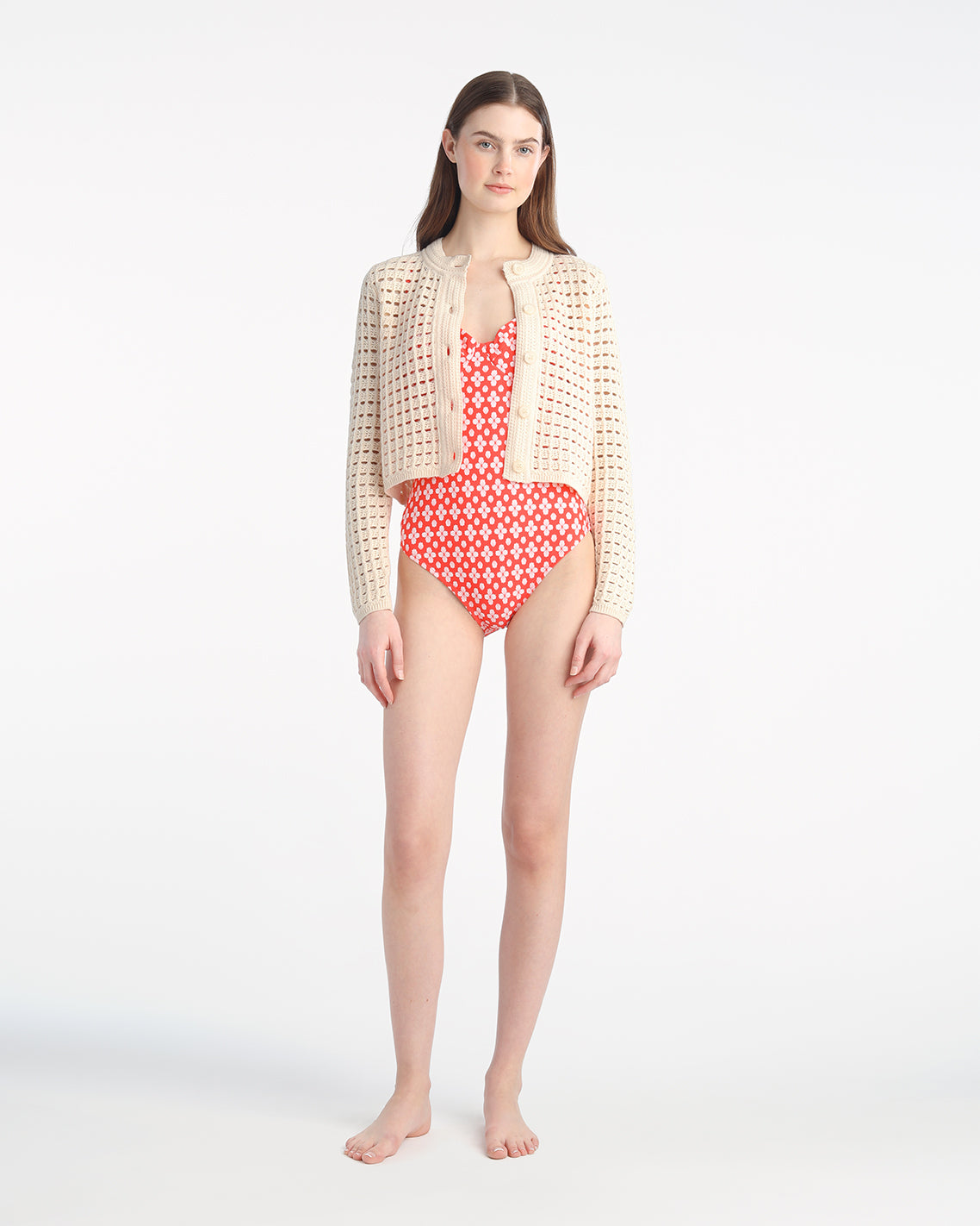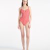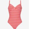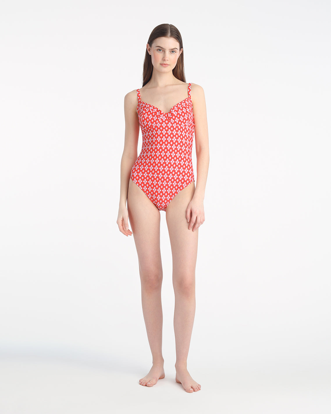 Better off red. Our Red Geo One Piece bathing suit is cut from a geometric-printed fabric and features built-in underwire for extra support. Just add sunglasses and a sarong or skirt for the perfect pool-party look!