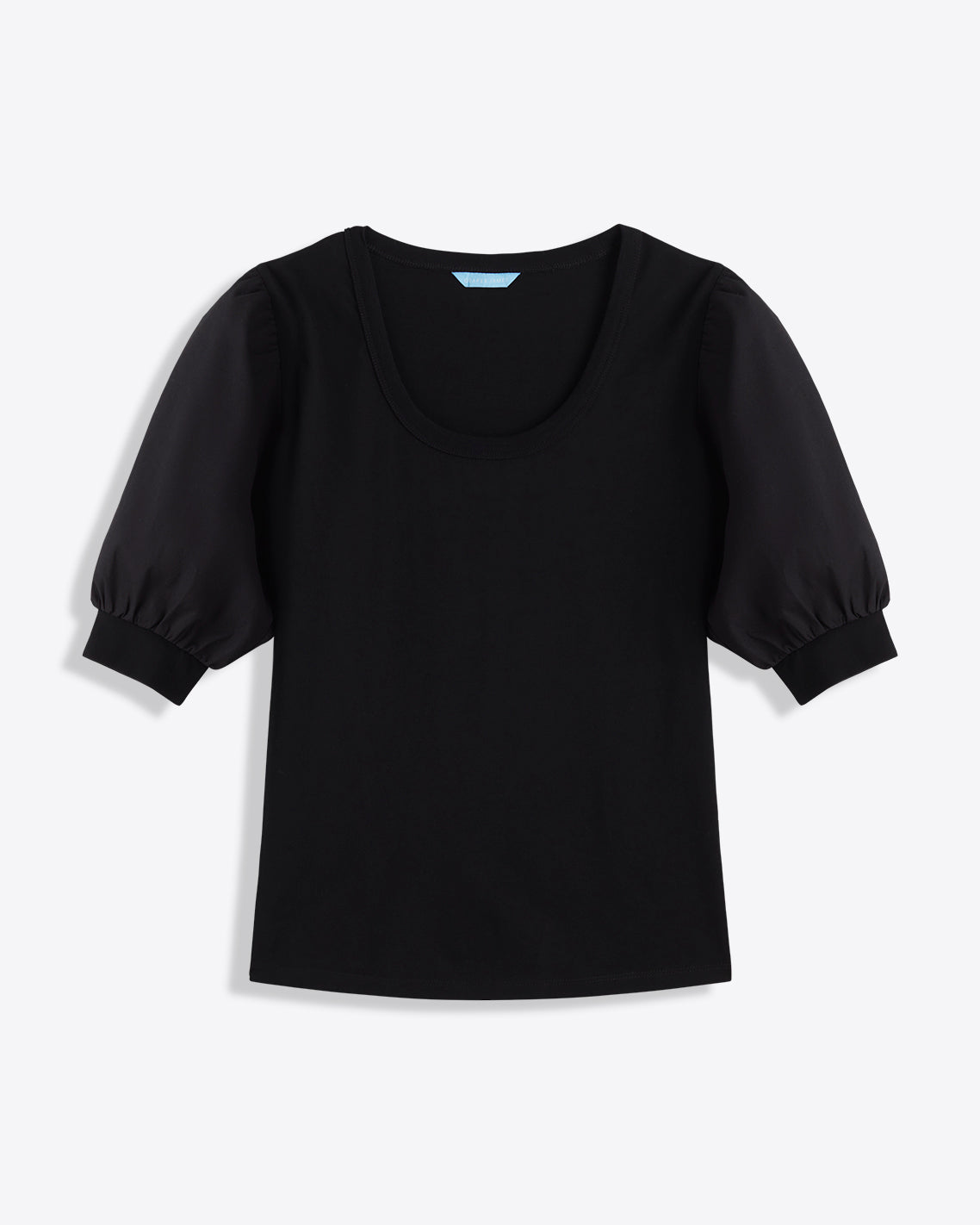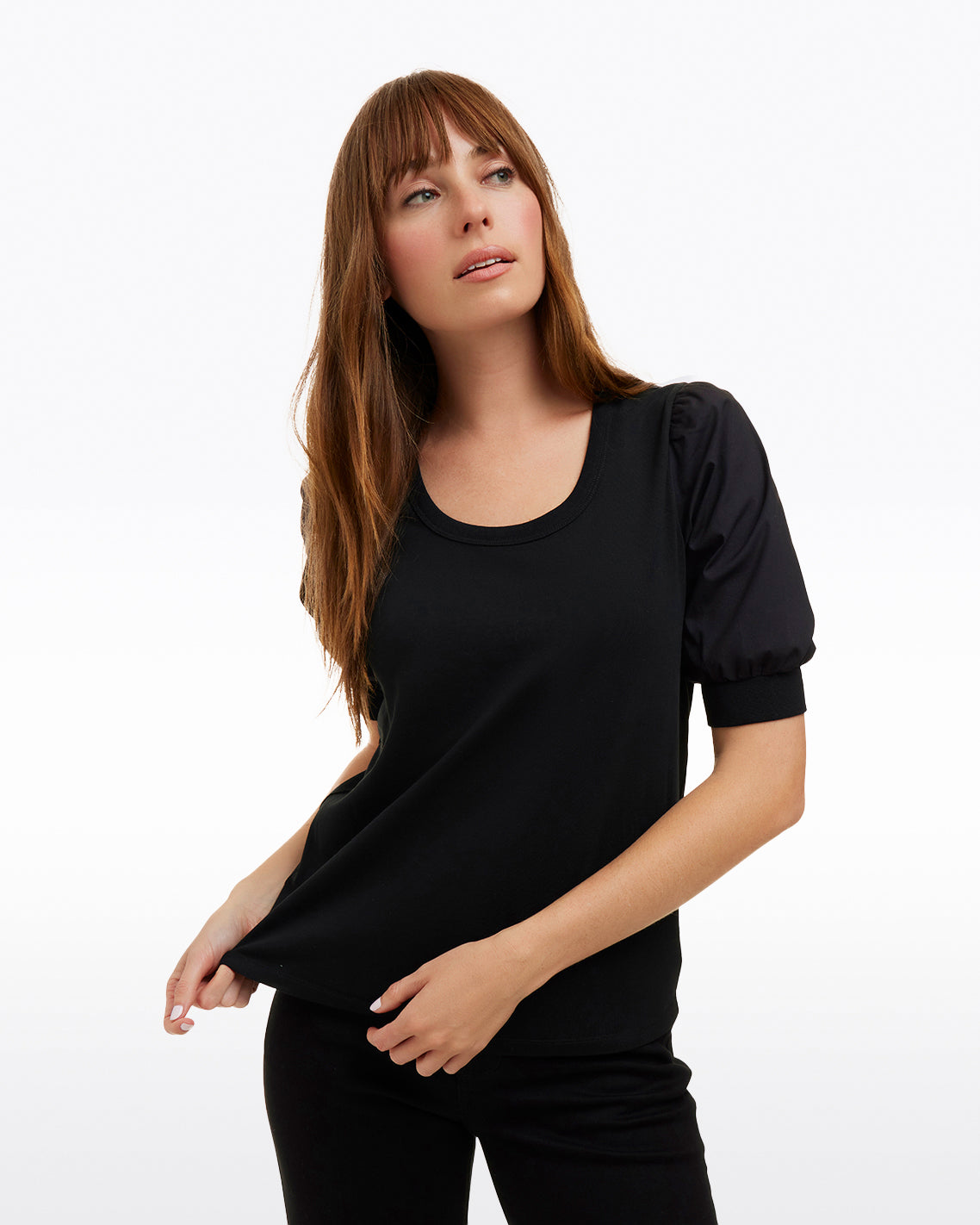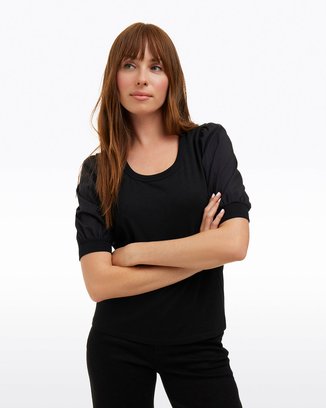 Mix things up. Our Short Sleeve Mixed Media Top is made from 100% cotton jersey and poplin and finished with a flattering scooped neckline. The result? A shirt that’s as easy to wear as your favorite tee, but significantly more polished.