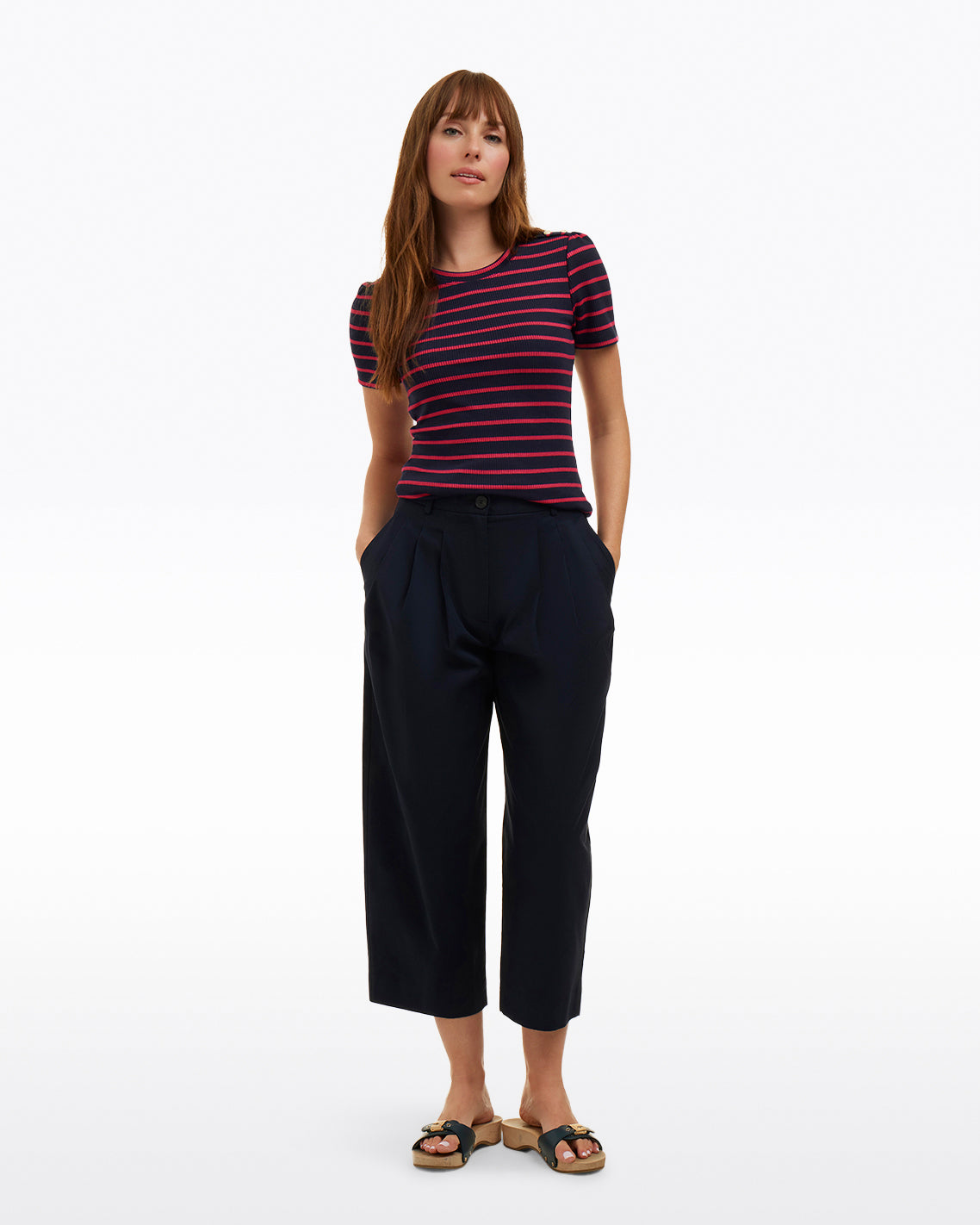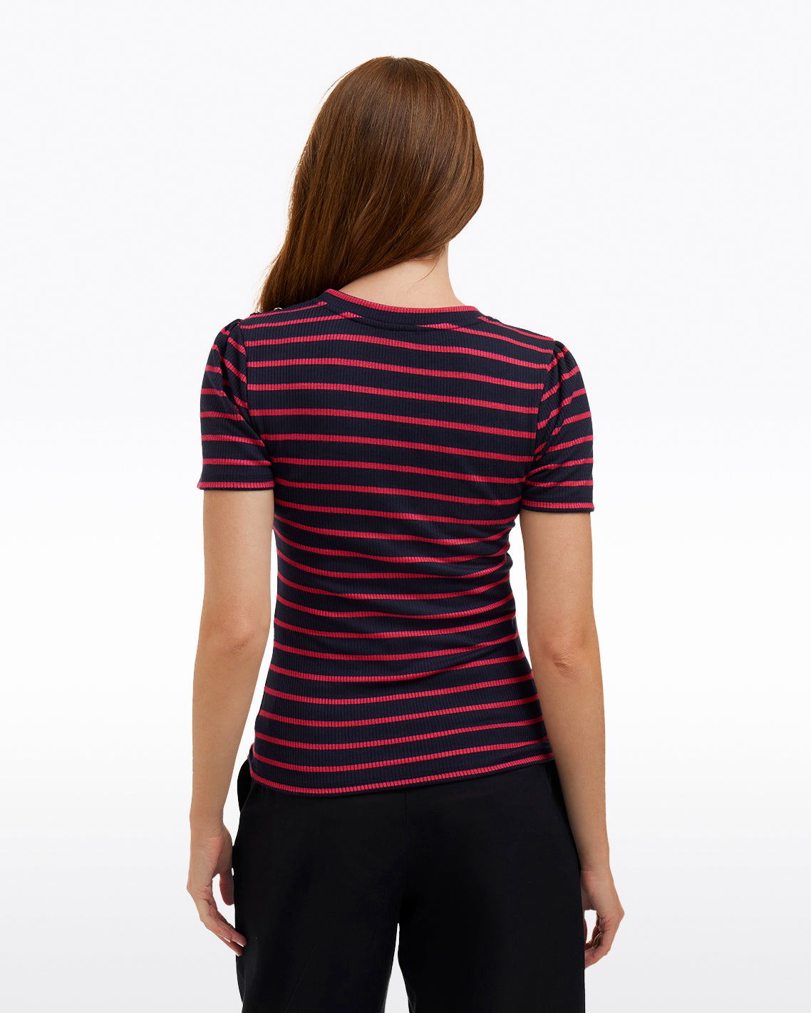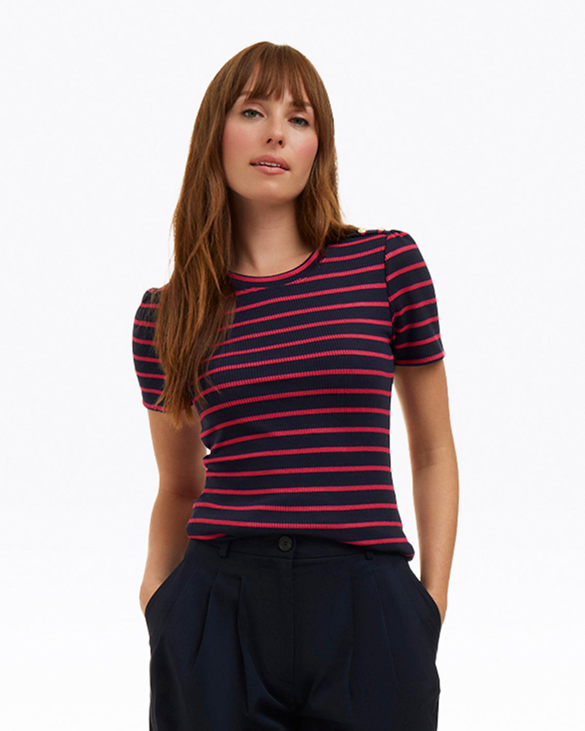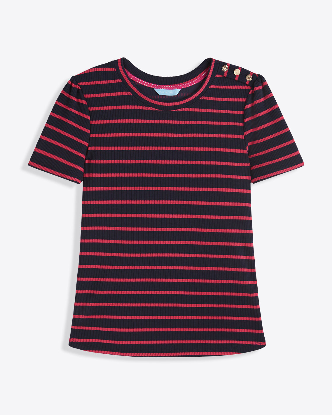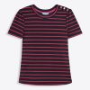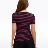 Show your stripes. Constructed from a soft, stretchy knit, our Stripe Crewneck Tee is as sleek as it is chic. Finished with a row of buttons on the shoulder, it has a classic look that’s a perfect match for your favorite jeans or pants. Wear it to work, weekend gatherings, wherever!