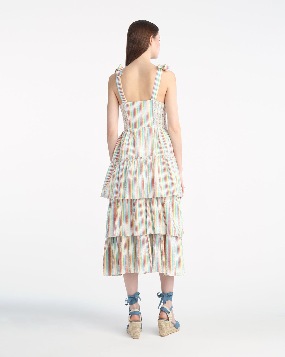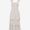 Chase rainbows. Our Taylor Tiered Midi Dress in Rainbow Stripe is made from brightly colored 100% cotton and finished with whimsical-yet-flattering details like self-tie shoulder straps and smocked side panels. Wear it with a pair of slip-on sneakers for day, and upgrade to high-heeled sandals for night.